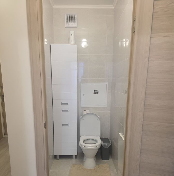 Санузел раздельный, оформлен в светлых тонах. В прихожей предусмотрены вместительные шкафы для хранения вещей. В квартире установлены шкафы и другая мебель.