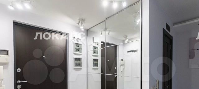 Просторная прихожая с большим зеркальным шкафом для одежды.