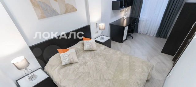 Просторная спальня имеет встроенный шкаф, кровать с 2 тумбами, рабочую зону со столом и имеет выход на балкон.