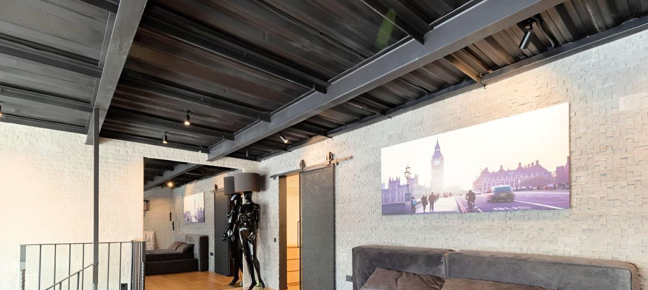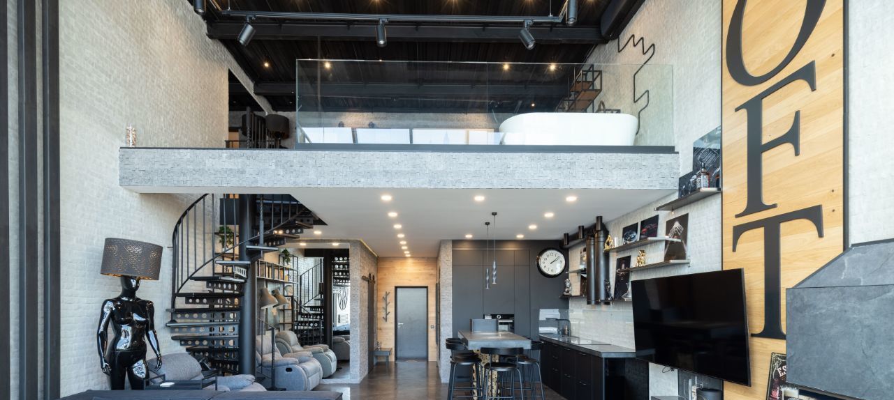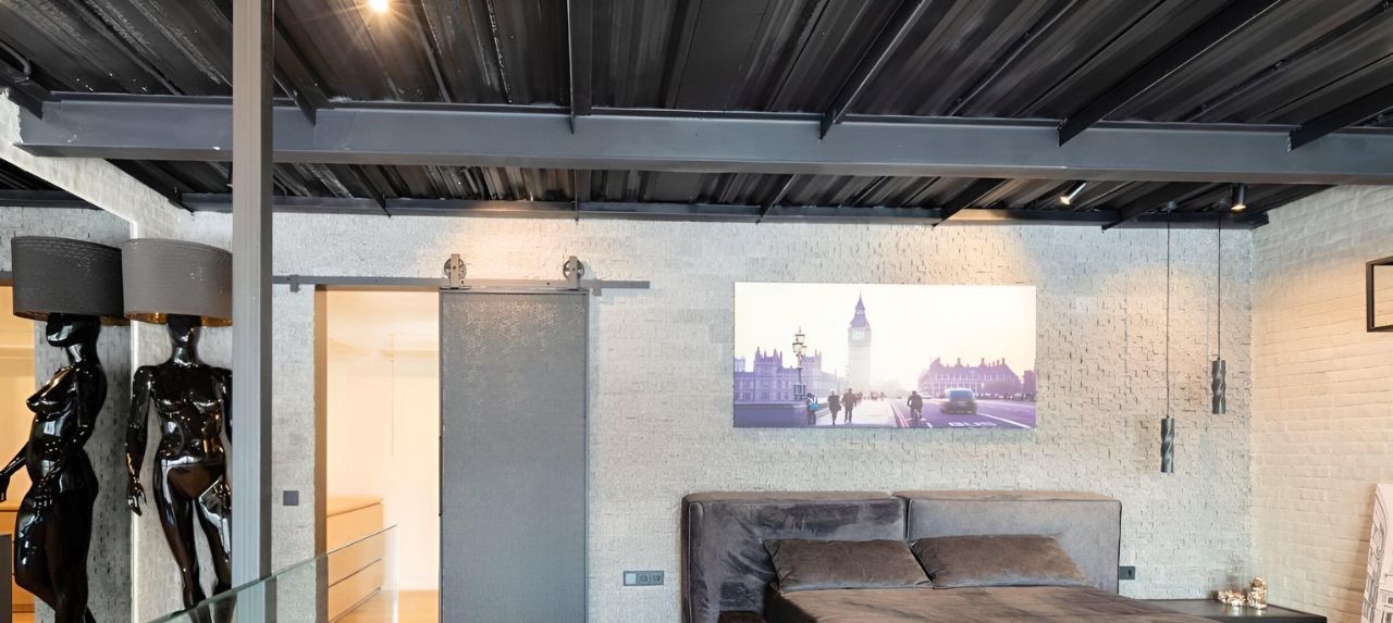 На 1 этаже при входе в пентхаус расположена прихожая с вместительной гардеробной и гостевым санузлом, далее просторная кухня оборудованная всей необходимой мебелью и техникой для Вашего комфортного проживания, гостиная с дровяным камином и большим диваном, с которой можно выйти на террасу и полюбоваться городским пейзажем и закатом, а утром можно насладиться рассветом. На второй этаж Вы поднимаетесь по круговой лестнице и попадаете в спальню с отдельно стоящей ванной, как в дорогих отелях. Открытая планировка и отсутствие стен в спальне добавляют простора и создают общее пространство с первым этажом. Также на втором этаже находится санузел с душевой и гардеробная для Ваших вещей. Продуманная планировка и дизайн с стиле ЛОФТ создают аутентичную атмосферу и незабываемые ощущения. Все решения в дизайне и мебели кастомные и выполнены в единственном экземпляре.