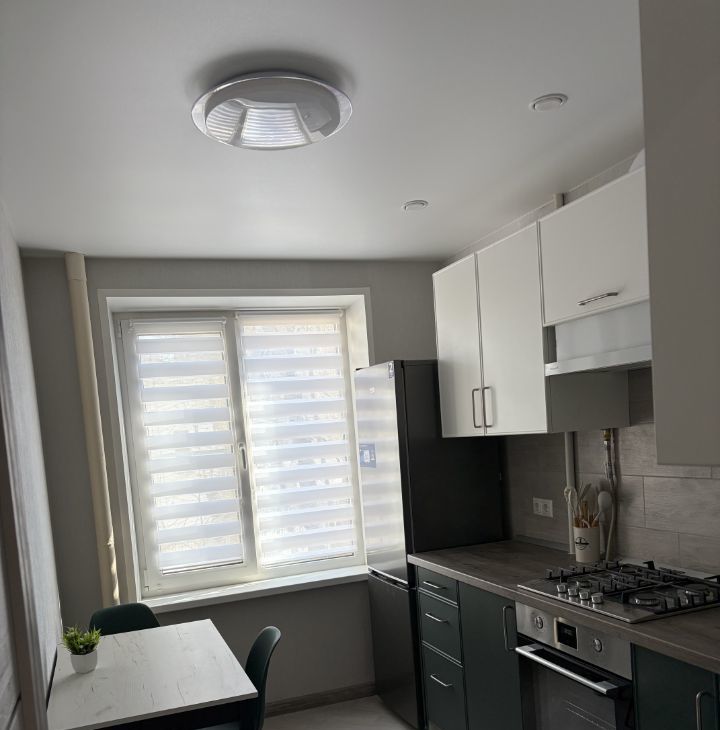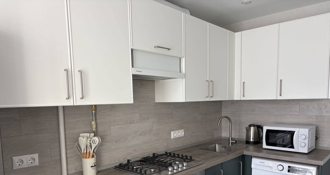 Техника: варочная панель, духовой шкаф, большой холодильник (300 л), стиральная машина, микроволновая печь, чайник