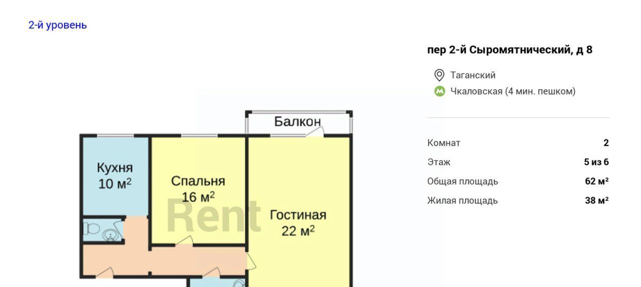 2-к кв. Москва 2-й Сыромятнический пер., 8 (62.0 м²)