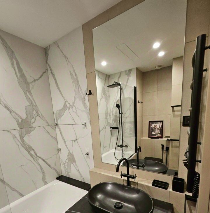 Полностью меблирована и оснащена всей современной техникой: духовой шкаф, посудомойка, СВЧ, холодильник с фильтром питьевой воды, стиральная машина