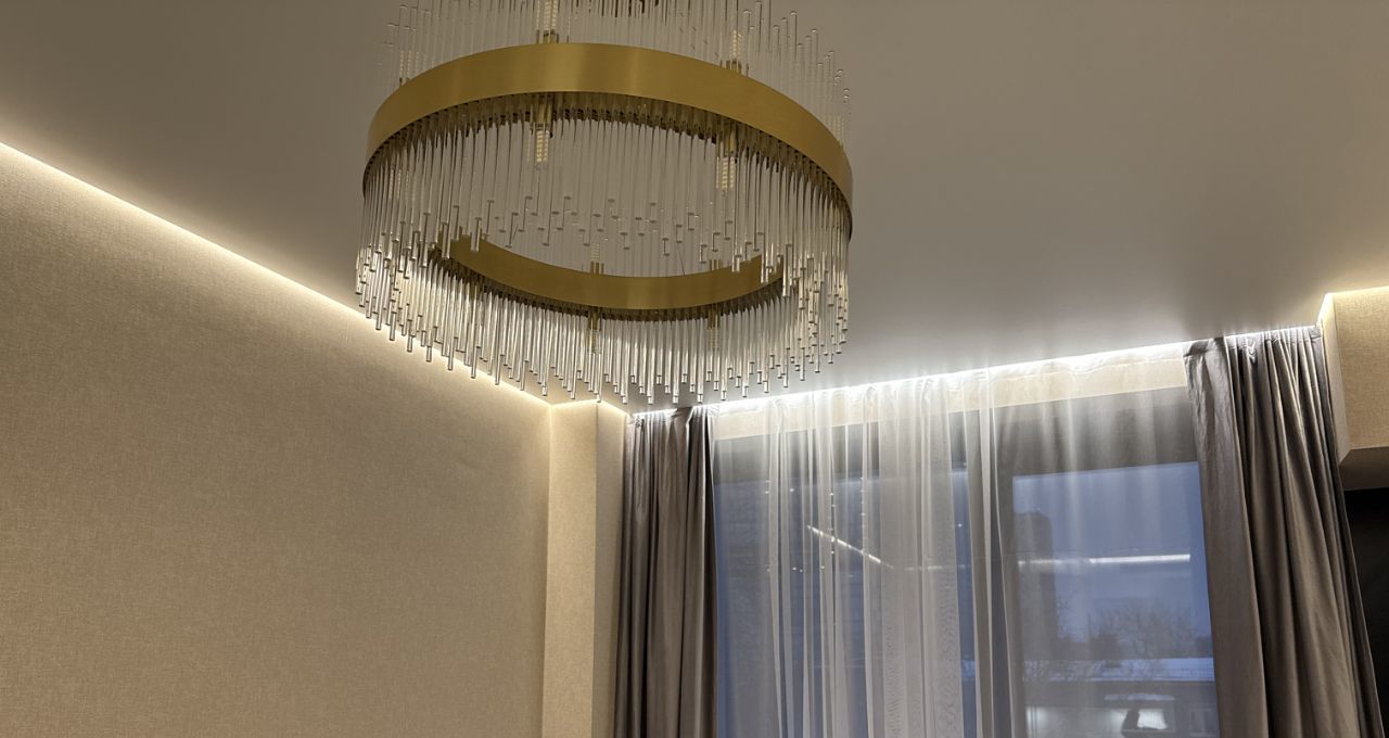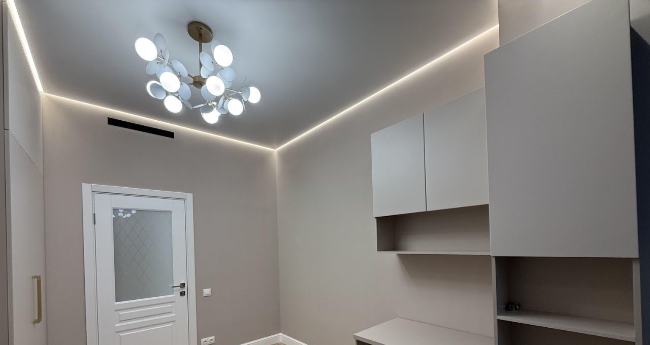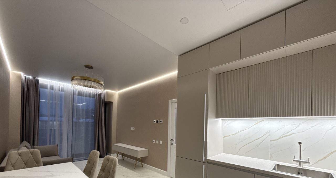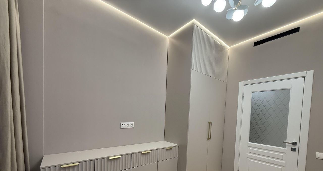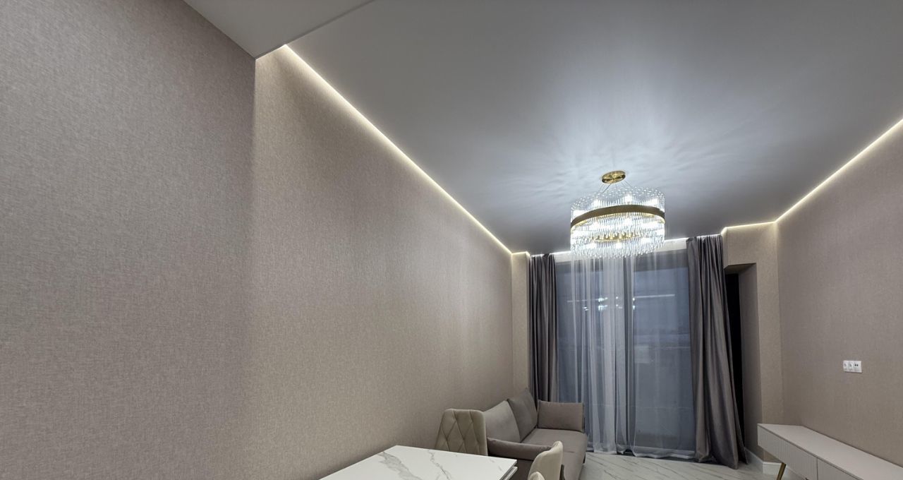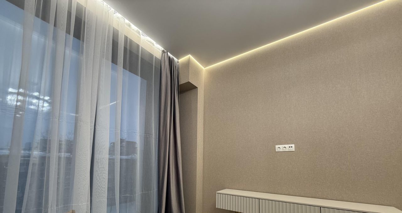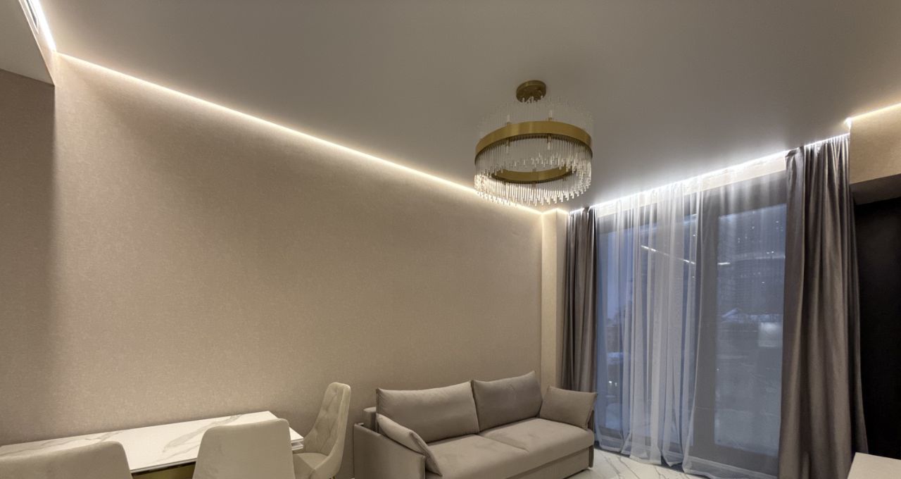 Освещение по всей квартире в нескольких режимах, парящий потолок с подсветкой , теплый пол. Высокие потолки 2,85 метра.