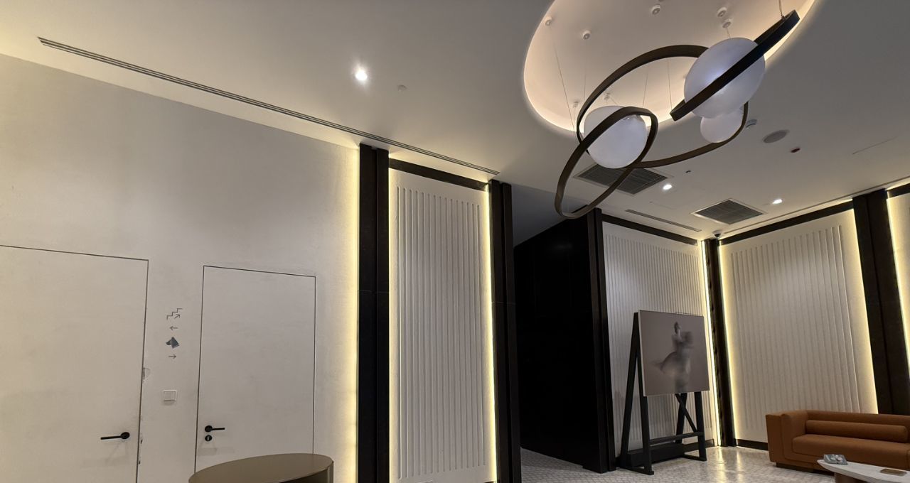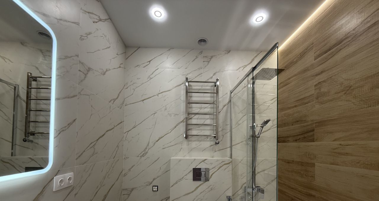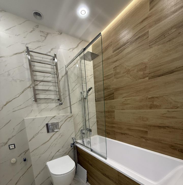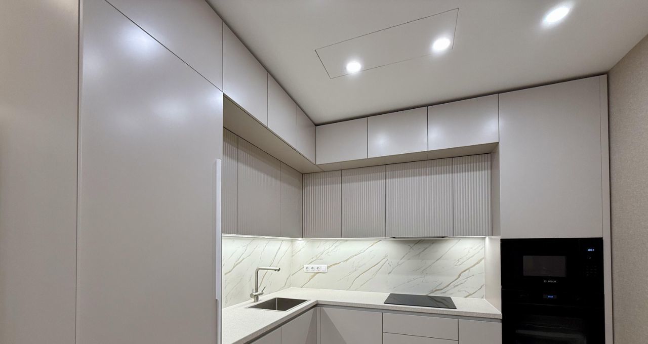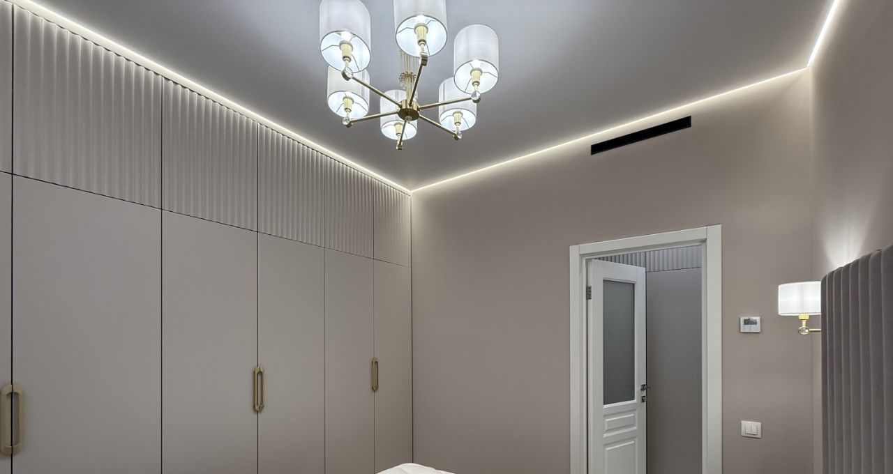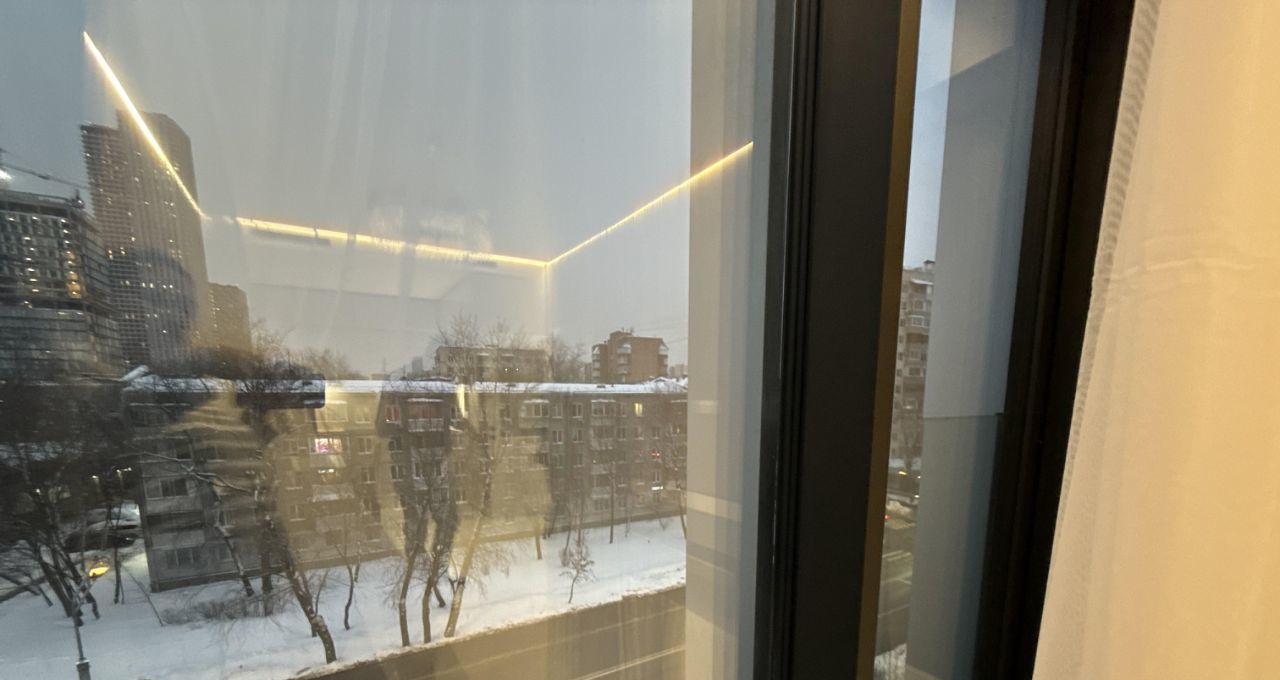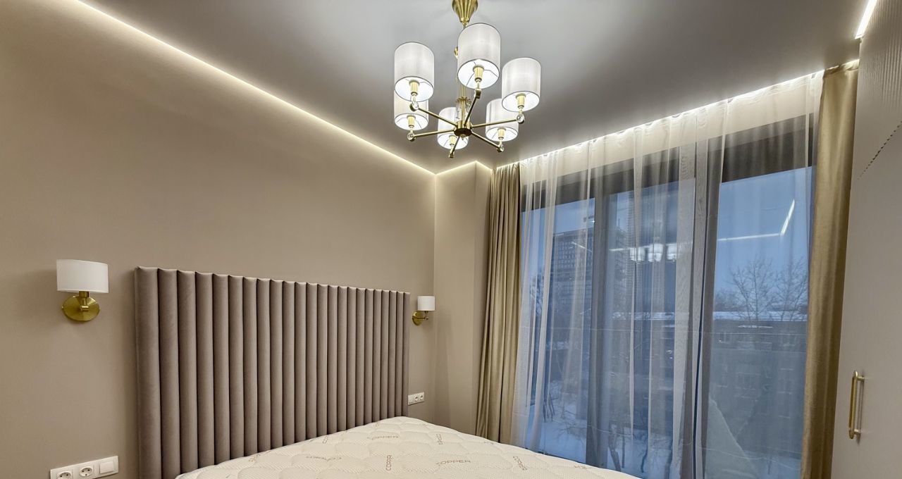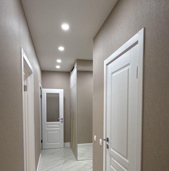 Освещение по всей квартире в нескольких режимах, парящий потолок с подсветкой , теплый пол. Высокие потолки 2,85 метра.