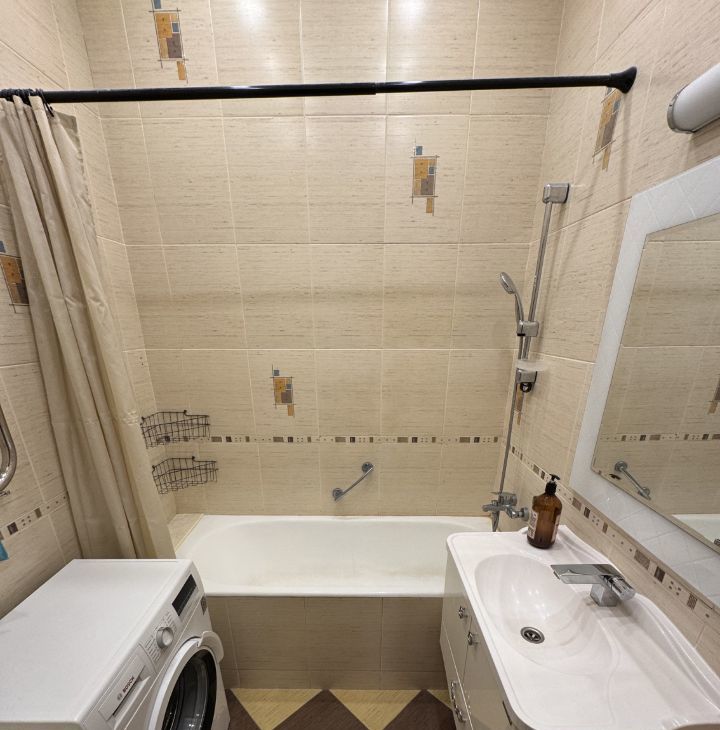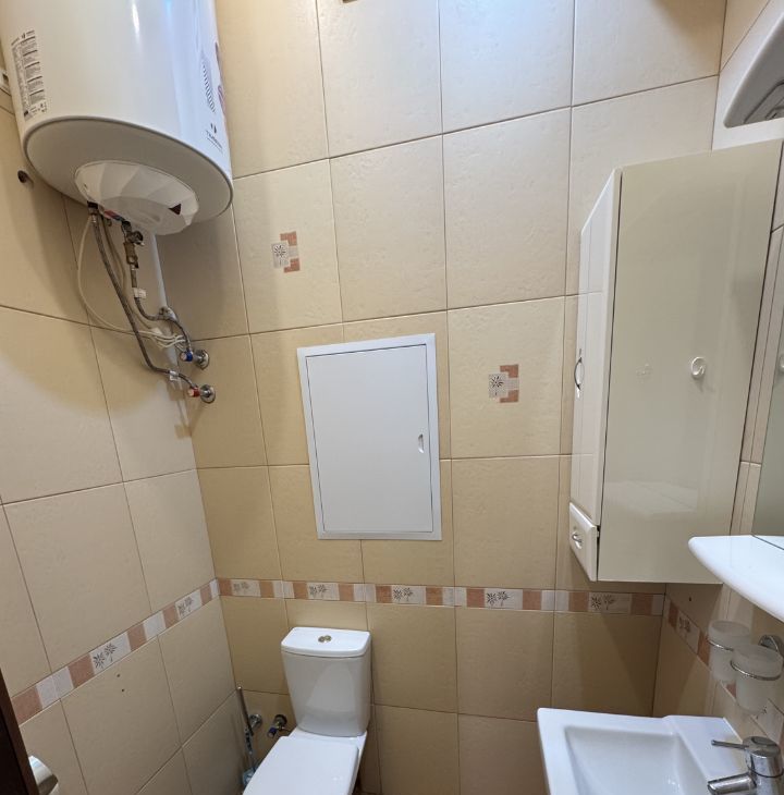 Кухня площадью 15 м² оборудована всей необходимой техникой, включая холодильник. В ванной установлена стиральная машина, а в туалете водонагреватель, так что проблем в момент отключения центрального горячего водоснабжения не будет. В гостиной и спальне установлены кондиционеры.