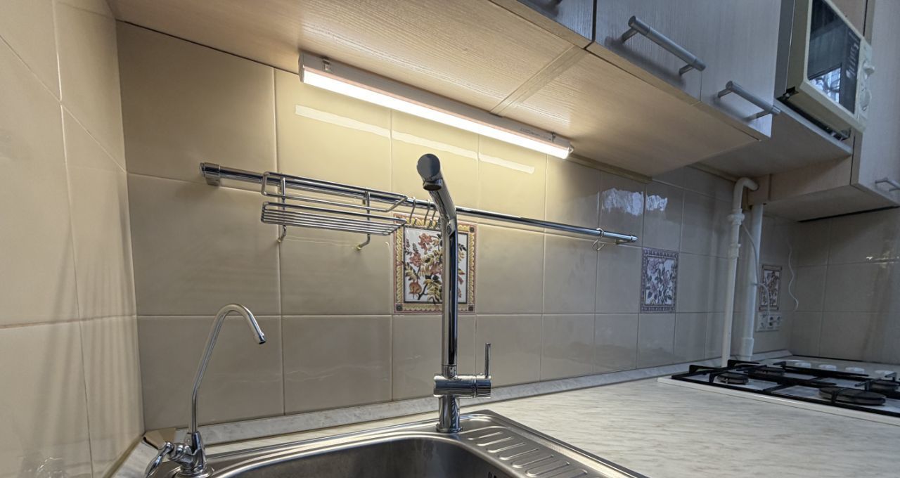 - Кухня полностью оборудована: гарнитур, холодильник, плита (газ), микроволновка, фильтр с краном питьевой воды, стиральная машинка Aeg, стол с парой стульев.