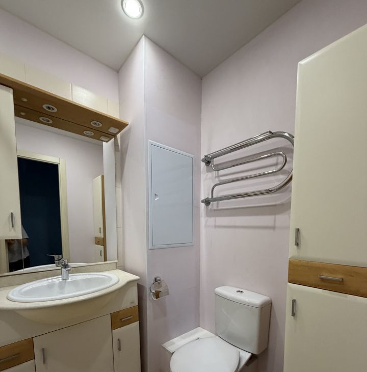 - Просторный сан узел с большой ванной, тумбой с раковиной + полками + зеркалом, туалетом, подвесным шкафом сбоку.