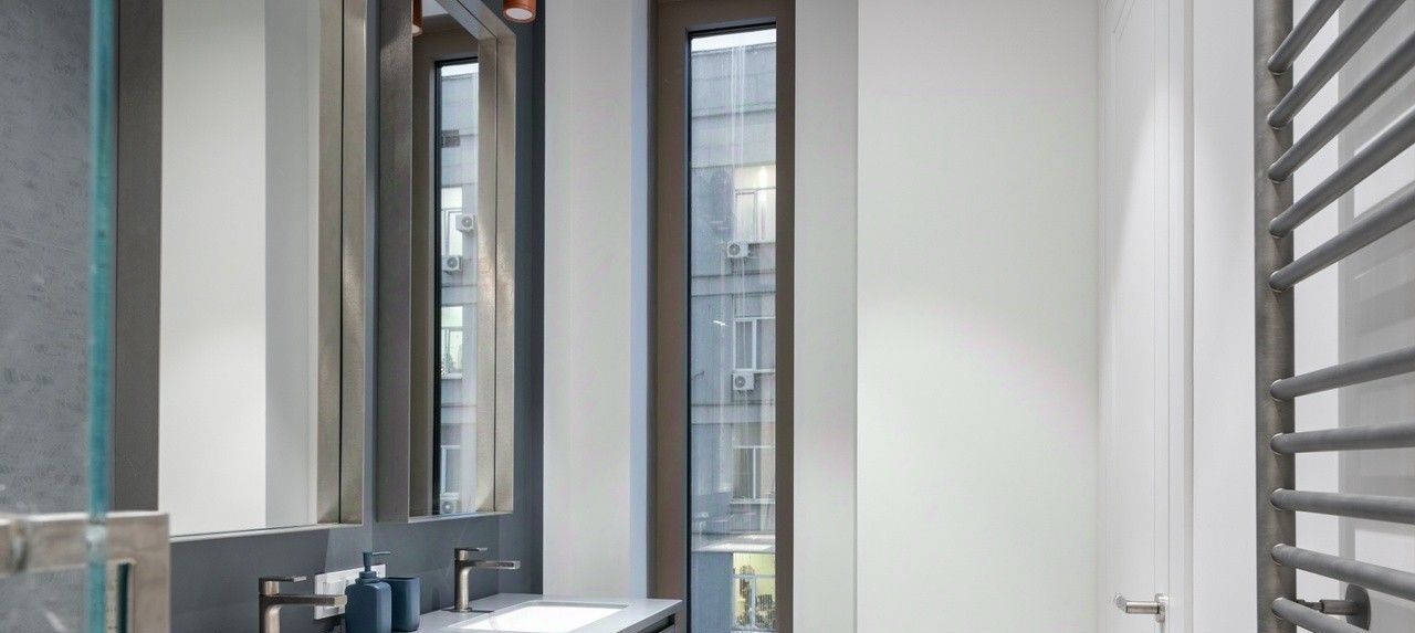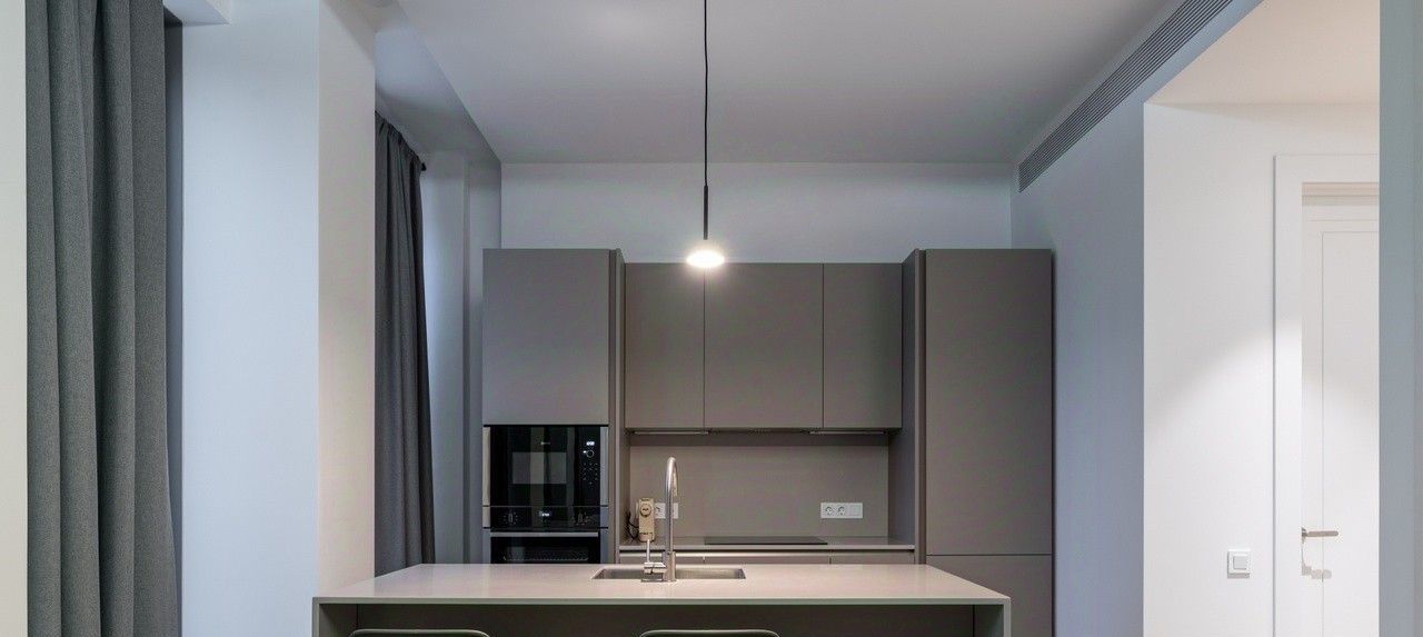 Квартира полностью меблирована и готова для комфортного проживания. На кухне установлен гарнитур с посудомоечной машиной, духовым шкафом, холодильником и кондиционером. В ванной комнате — душевая кабина. Организована гардеробная комната.