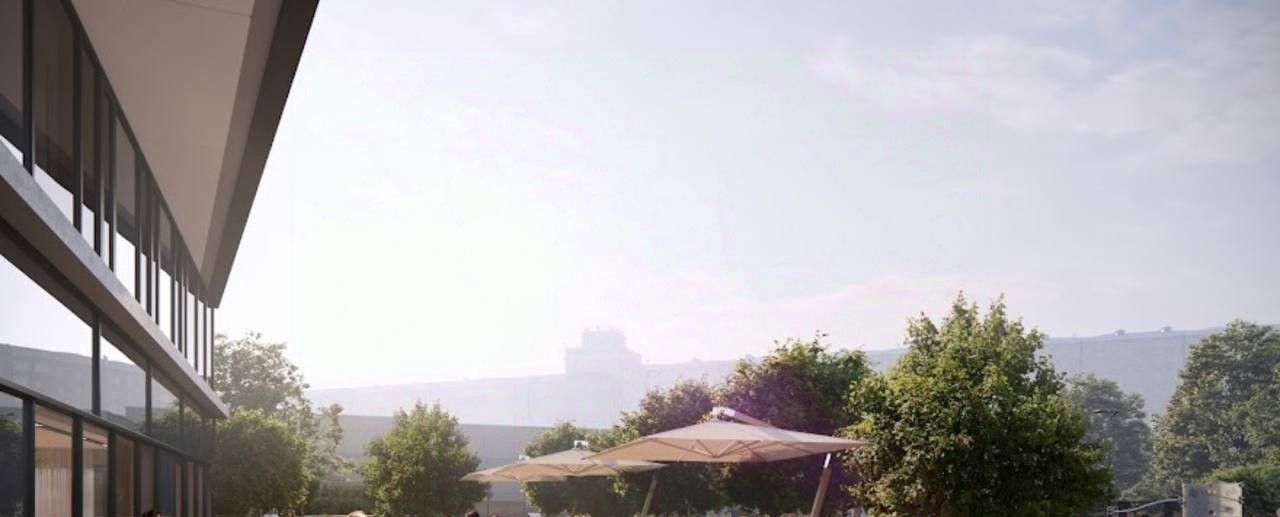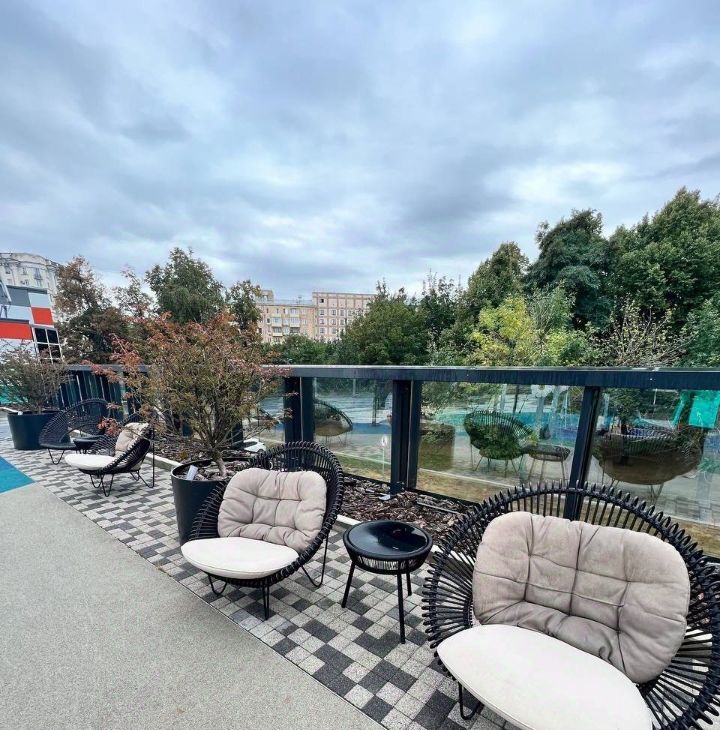 Фитнес зал для жителей и отельное пространство для отдыха на уровне 2 этажа - современная детская площадка, удобные уличные кресла, столы, скамейки.