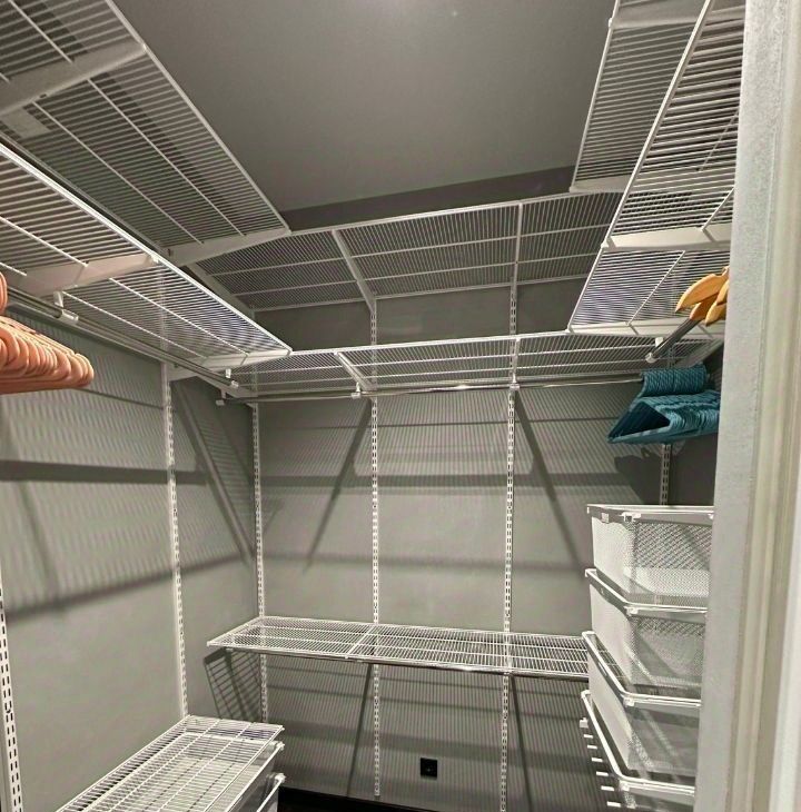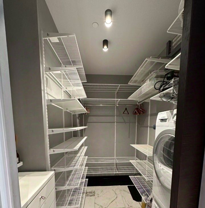 Просторный коридор с большой гардеробной: постирочная зона (стиральная и сушильная машины), система хранения, трюмо.