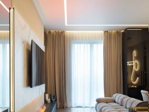 Функциональная планировка включает просторную гостиную-столовую-кухню, спальню с ванной комнатой, библиотеку, прихожую и гостевой санузел с душевой кабиной. Интерьер оформлен по авторскому дизайн-проекту.
