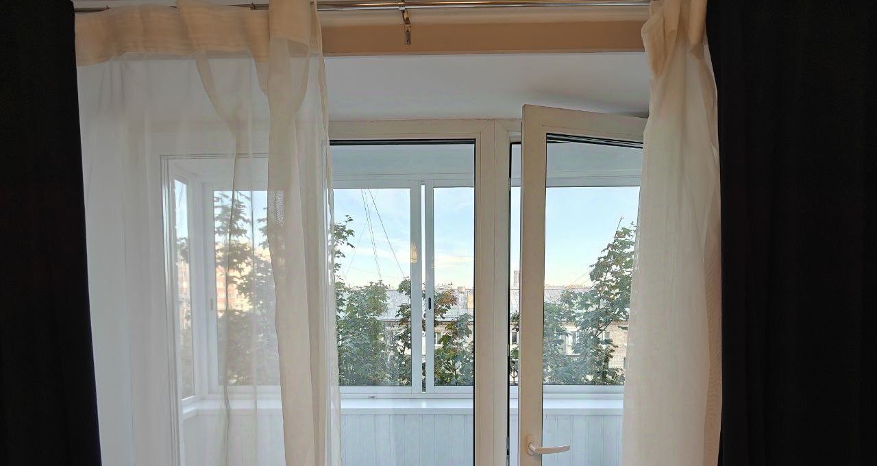 Уютная спальня с выходом на балкон на уровне крон деревьев. С балкона открывается приятный вид на крыши соседних домов. Рядом нет высотных зданий, что делает вид с балкона особенно приятным, напоминает Париж таким, как мы привыкли о нем думать.