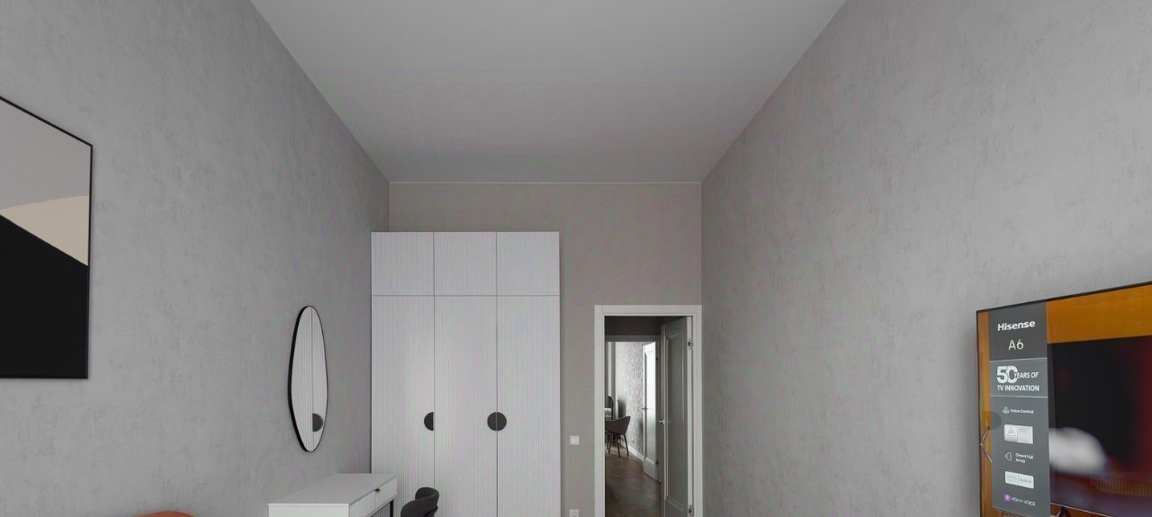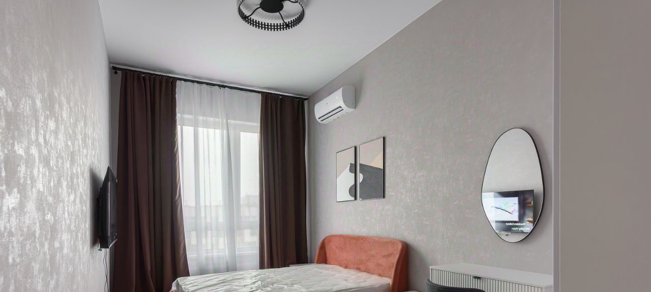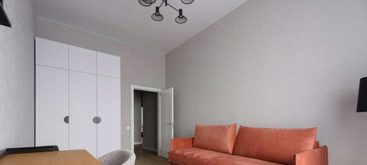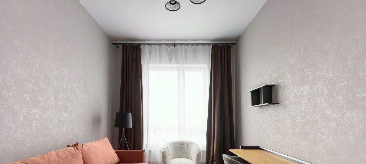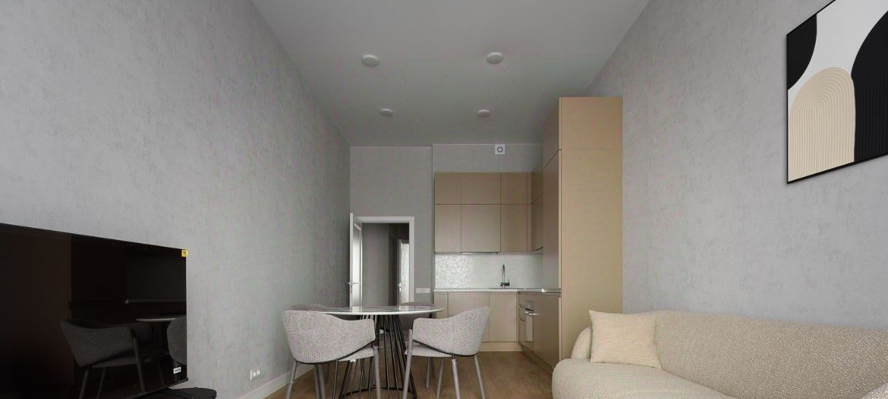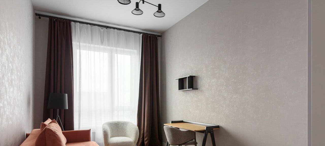 Квартира в светлых тонах с кухней, кабинетом и спальней. В ней есть вся мебель и техника дл комфортной жизни: кухонный гарнитур, диван и кресло в обивке букле, раскладной диван в красивом терракотовом оттенке, обеденная группа с каменной столешницей, два шкафа в каждой комнате, журнальный столик и другие элементы декора. Из техники: духовой шкаф, посудомоечная машина, стиральная машина, телевизор с широким экраном, индукционная плита на 4 конфорки, вытяжка.