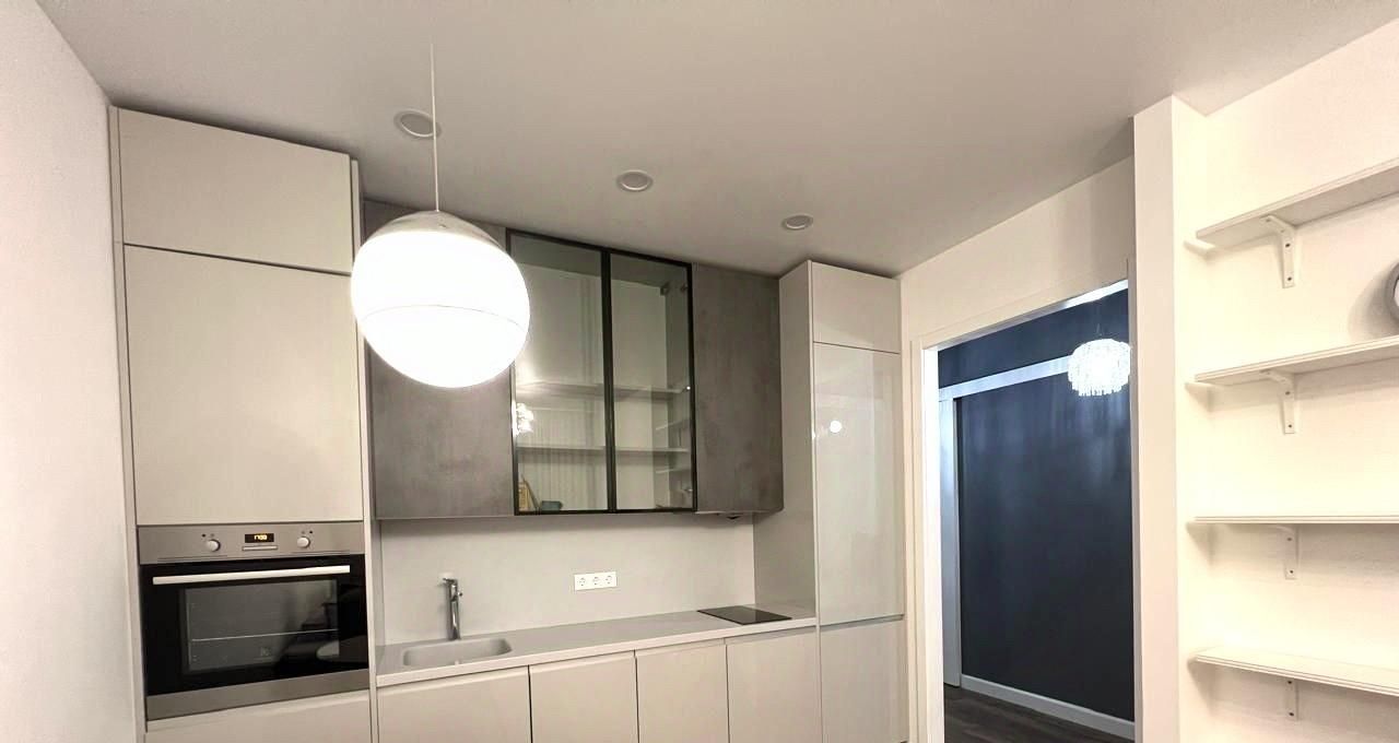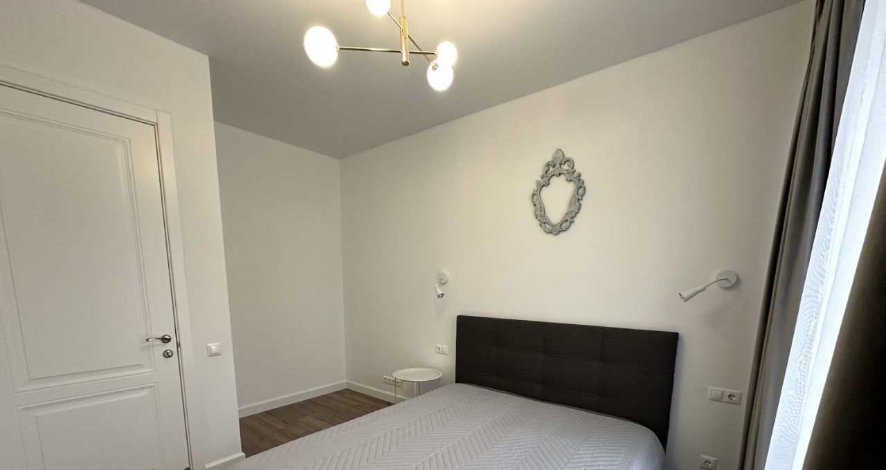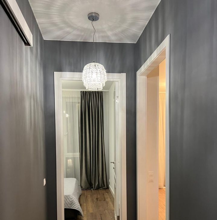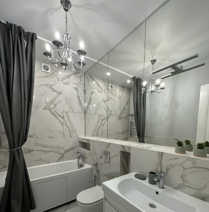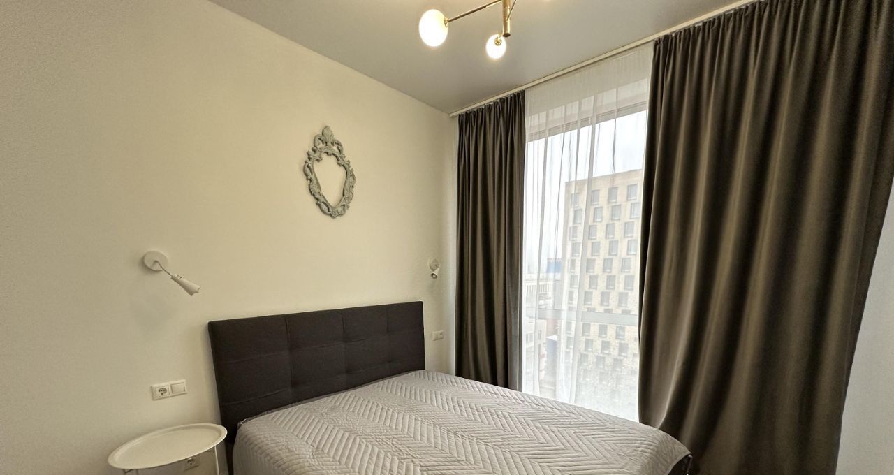 Квартира с евроремонтом, полностью готова к проживанию. Внутри есть всё необходимое: современная мебель в комнате и на кухне, бытовая техника — кондиционер, холодильник, посудомоечная машина, телевизор и стиральная машина. Ванная комната оборудована ванной, санузел совмещённый. Окна выходят во двор, поэтому в квартире всегда тихо и спокойно.