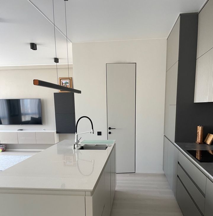 В гостиной: кухонный гарнитур с островом. В наличии вся бытовая техника: холодильник, посудомоечная машина, электроплита и духовой шкаф. Обеденная зона, большой диван, телевизор.
