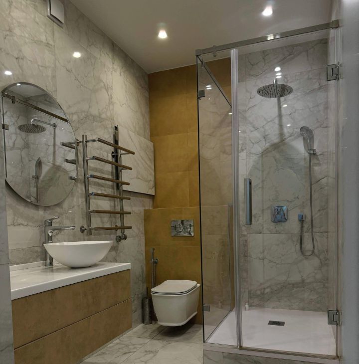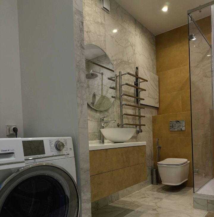 В квартире есть всё необходимое для комфортного проживания: современная мебель на кухне и в комнате, качественная техника — кондиционер, холодильник, посудомоечная и стиральная машины, два телевизора.Санузел совмещённый, оборудован душевой кабиной. Планировка продумана до мелочей, поэтому можно удобно разместить все вещи.