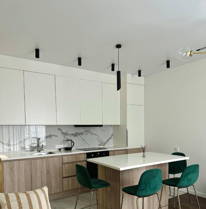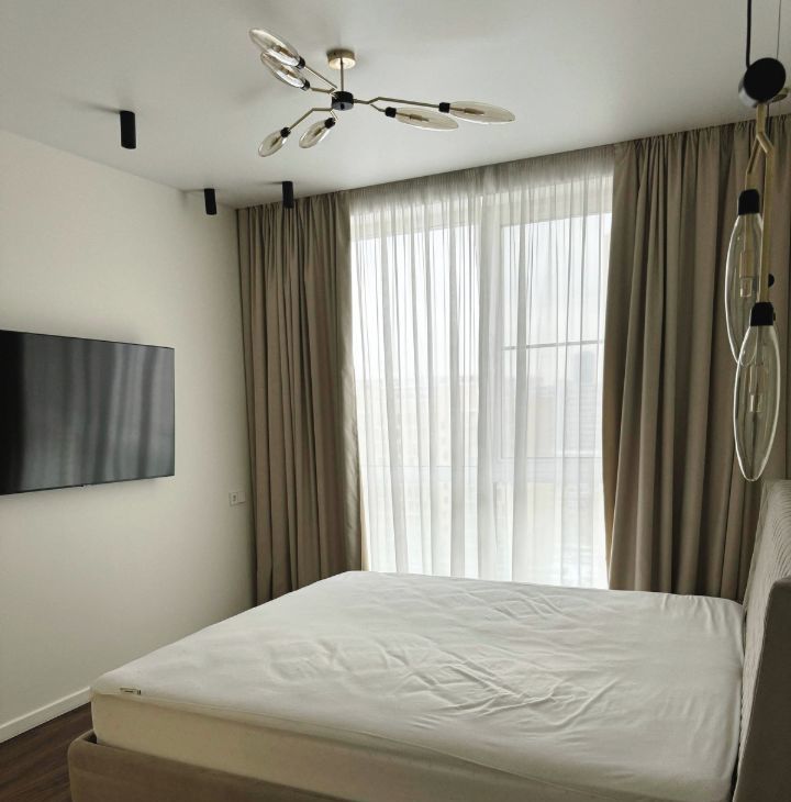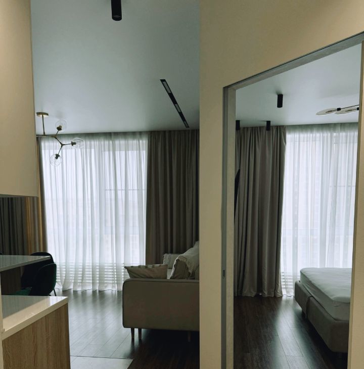 Предлагаем в аренду стильную двухкомнатную квартиру с ПАРКОВОЧНЫМ МЕСТОМ!! Метраж парковочного места (14,7кв.м). Квартира с дизайнерским ремонтом в современном кирпичном доме 2020 года постройки. Общая площадь — 46,5 кв. м, жилая — 28 кв. м, просторная кухня — 14 кв. м. Квартира расположена на 14 этаже 22-этажного здания, окна выходят во двор, что обеспечивает тишину и уют. Высокие потолки 3 метра добавляют пространства и света.