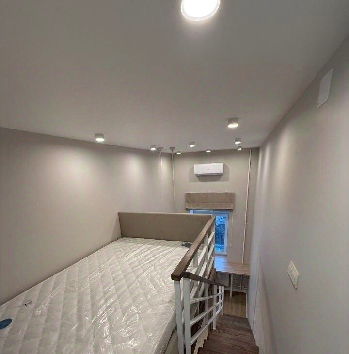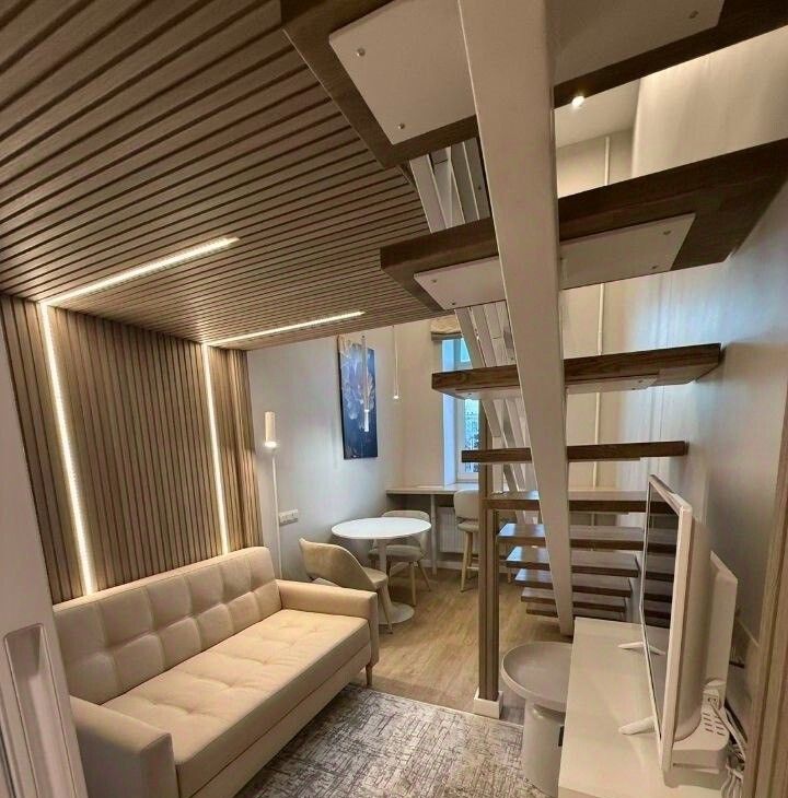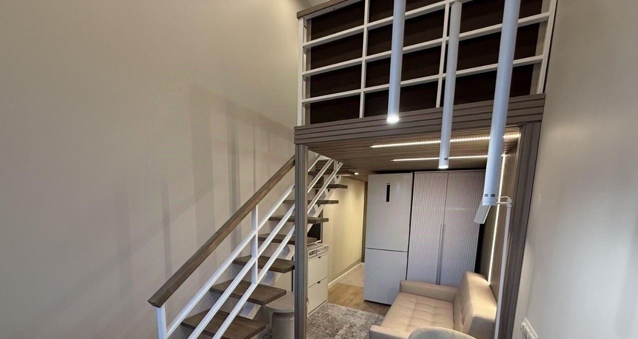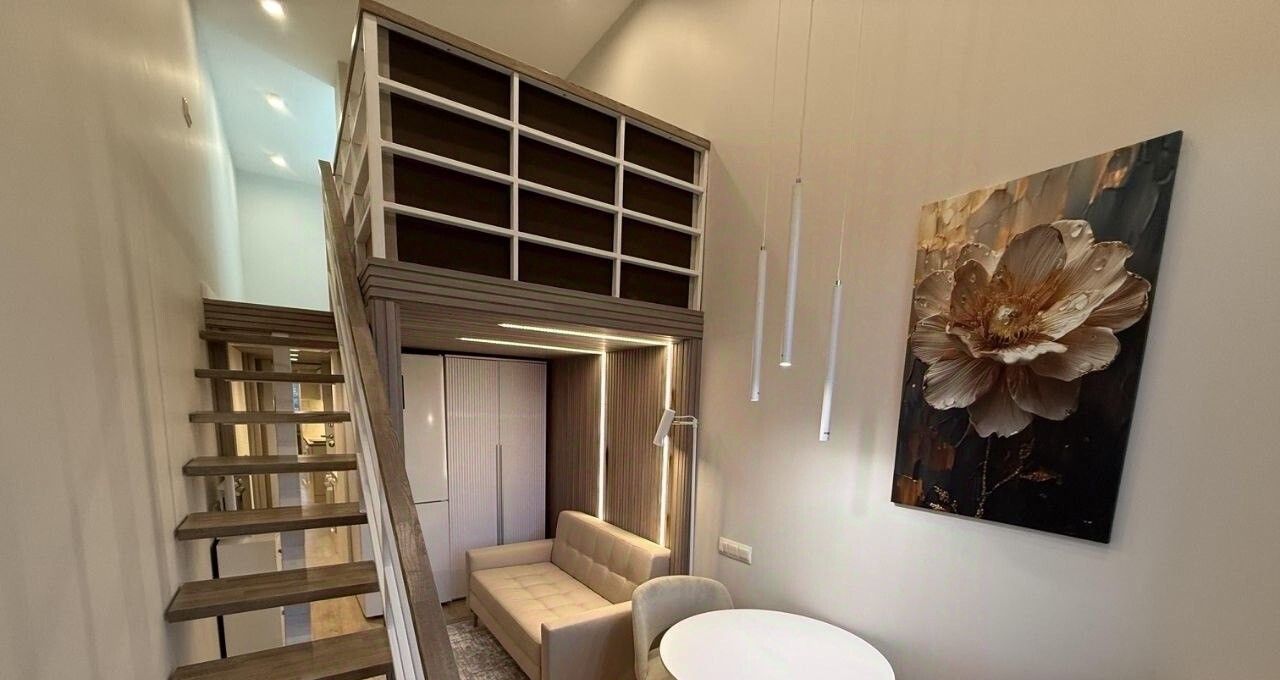 • Планировка: На первом этаже расположены просторная гостиная, кухня и зона для отдыха, что делает это пространство идеальным для приема гостей. На втором этаже находится уютная спальня с небольшим гардеробом