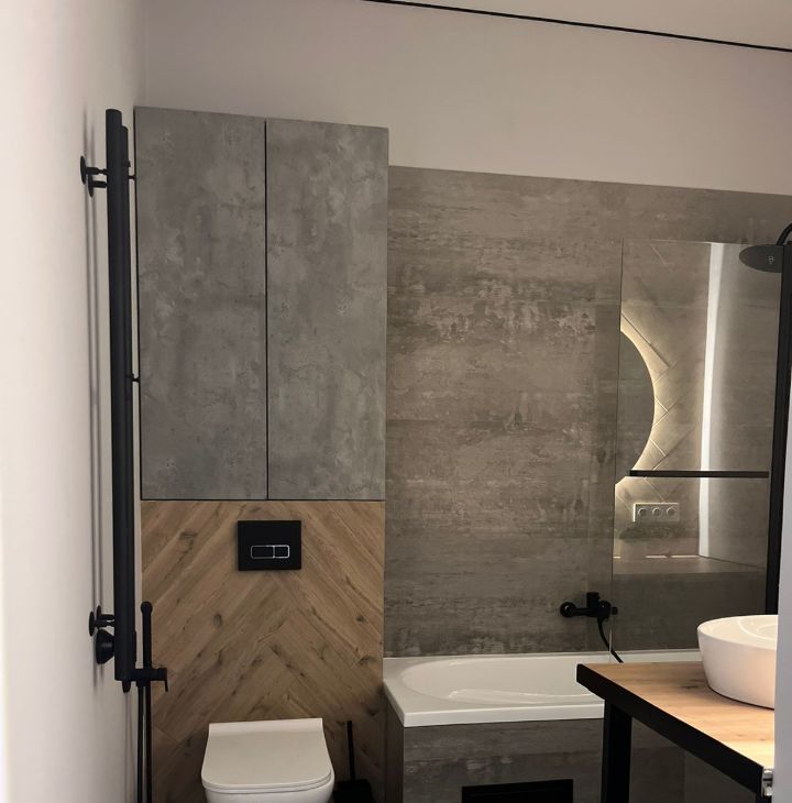 •Новая сантехника: унитаз, раковина, ванна, дизайнерские смесители.
