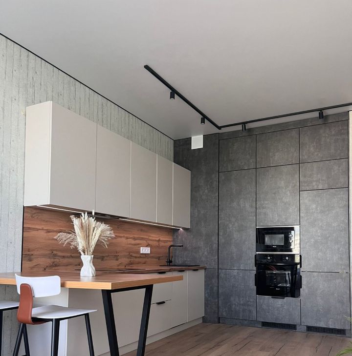 • Современная встроенная кухня с холодильником, посудомечной машиной, духовкой, варочной панелью, вытяжкой и дополнительной системой хранения.
