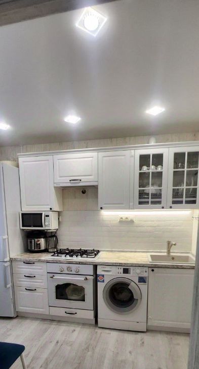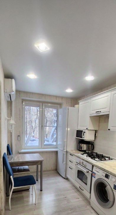 В квартире остаётся: встроенная кухня с бытовой техникой (кондиционер, холодильник, стиральная машина, варочная газовая панель, электрический духовой шкаф, микроволновка), угловой диван, двухспальная кровать, шкаф-витрина и тумба, прихожая.