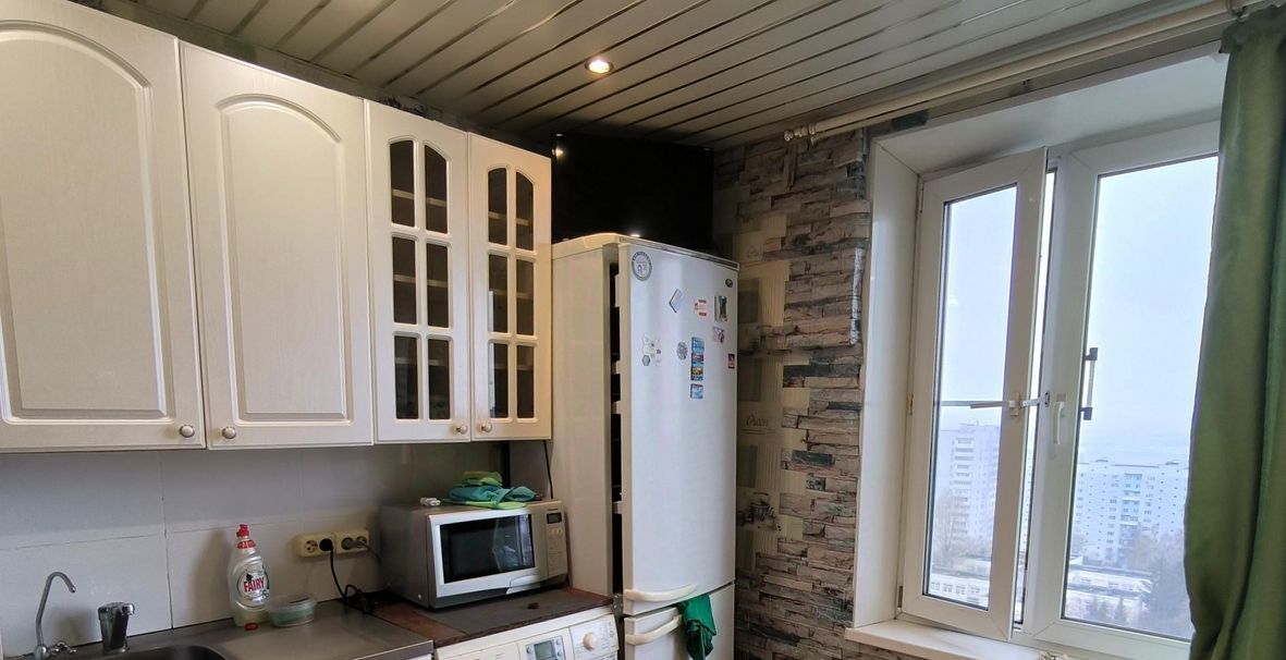На кухне из техники есть плита, вытяжка, холодильник, стиральная машина, микроволновка.