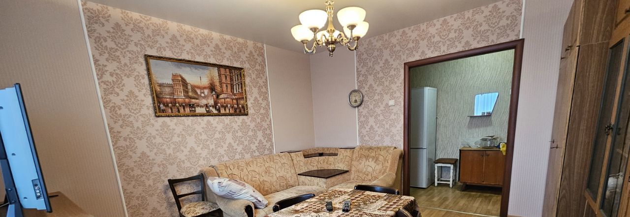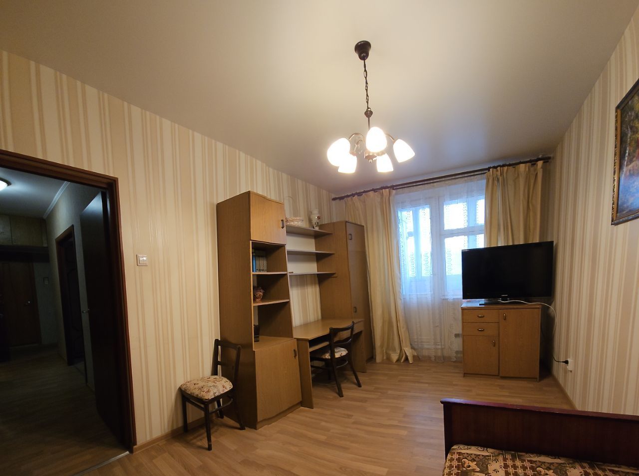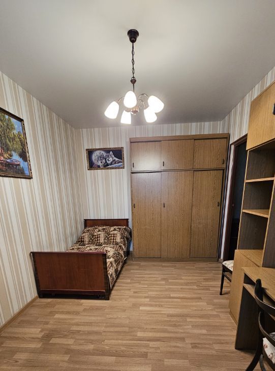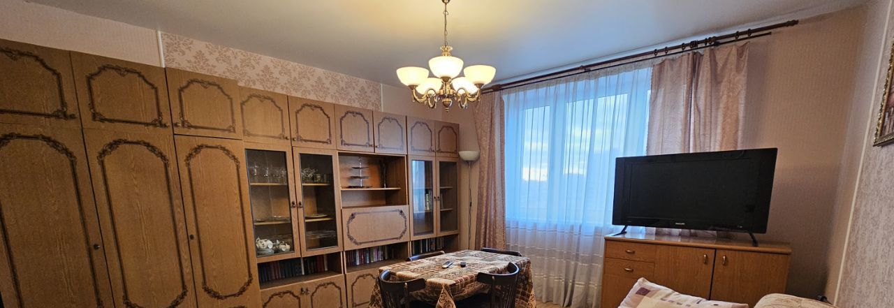 В большой комнате угловой диван, шкаф стенка, тумба с телевизором и столовый гарнитур. В маленькой комнате рабочий уголок, тумба с телевизором, кровать и шкаф-купе. Кухня просторная, есть плита, холодильник, телевизор, микроволновка, вытяжка.