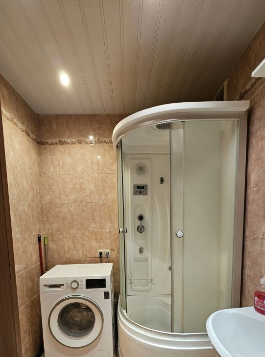 Ванная комната с душевой кабиной, раковиной и стиральной машиной.