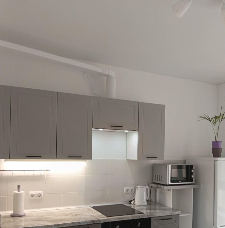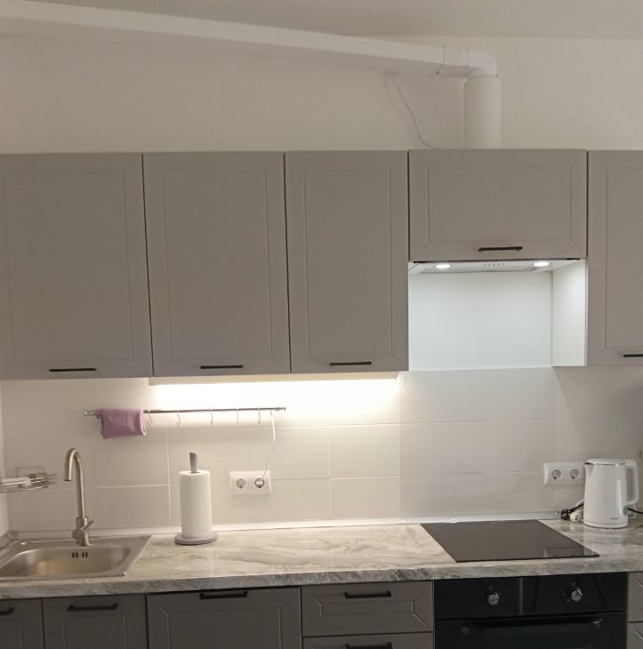На кухне установден кухонный гарнитур и вся необходимая техника для удобства - ПММ, микроволновка, встроенный духовой шкаф, керамическая варочная панель, холодильник, вытяжка, пылесос, электрочайник.