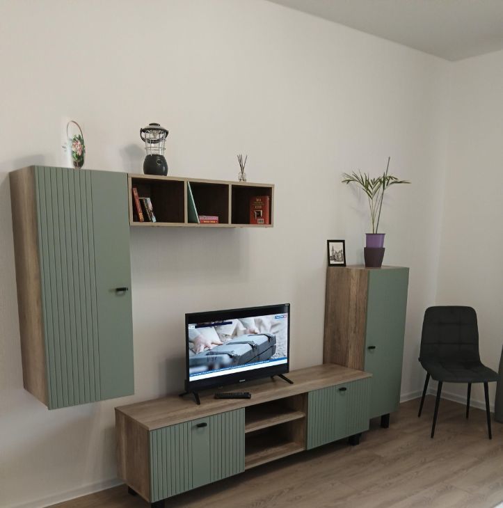 Гостиная оборудована раскладным современным диваном,тумбой, телевизором, полками, стелажом, столиком, стульями.
