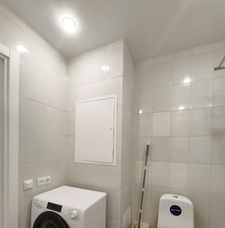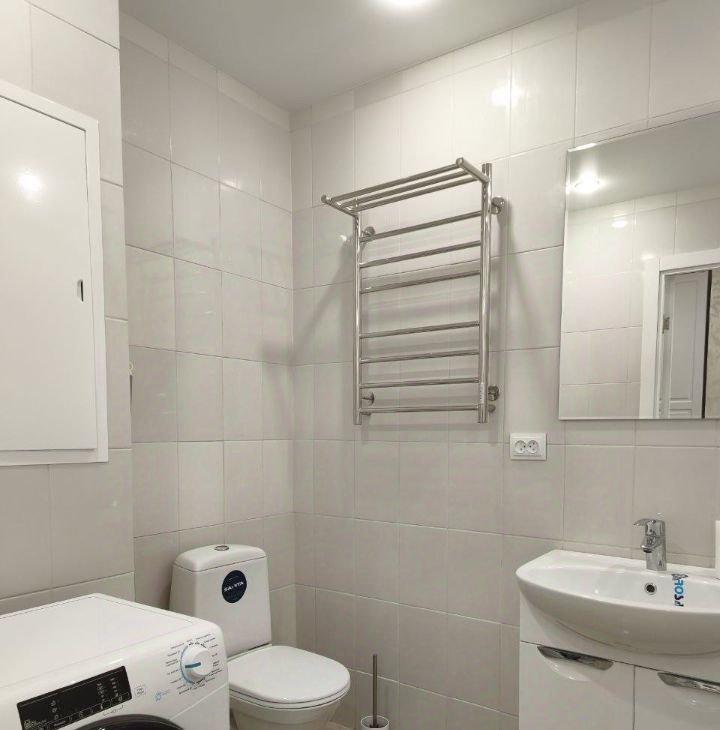 Санузел совмещённый, оборудован стиральной машиной, зеркалом с подсветкой и удобными аксессуарами.