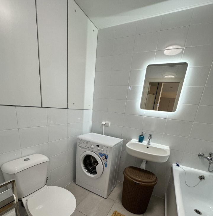 В спальне большая двуспальная кровать и вместительный встроенный шкаф. В ванной комнате совмещенный санузел с новой сантехникой и стиральной машиной.