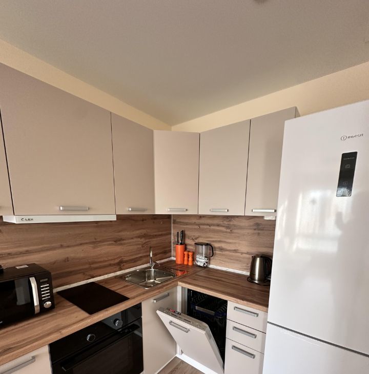 Кухня оборудована всей необходимой техникой: холодильник, плита, духовка, вытяжка, посудомоечная машина, микроволновка, чайник. Также есть посуда, фильтр для воды.
