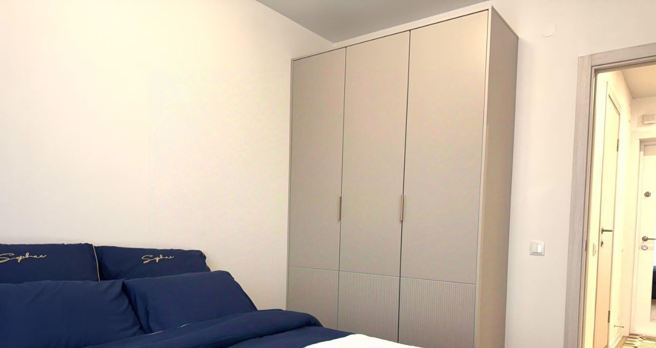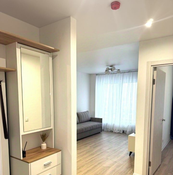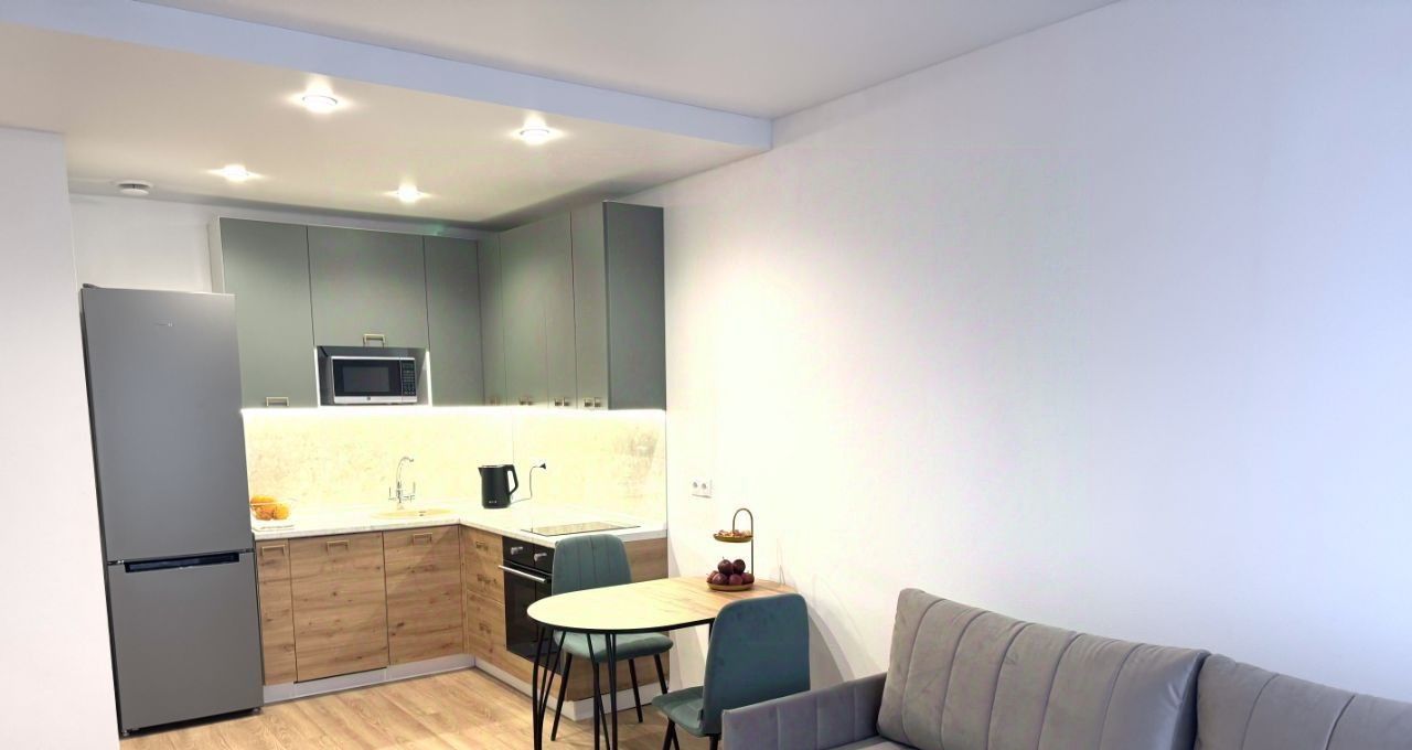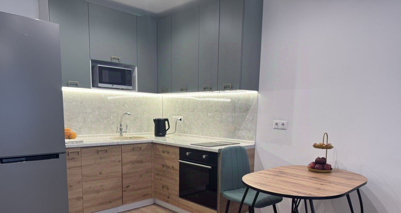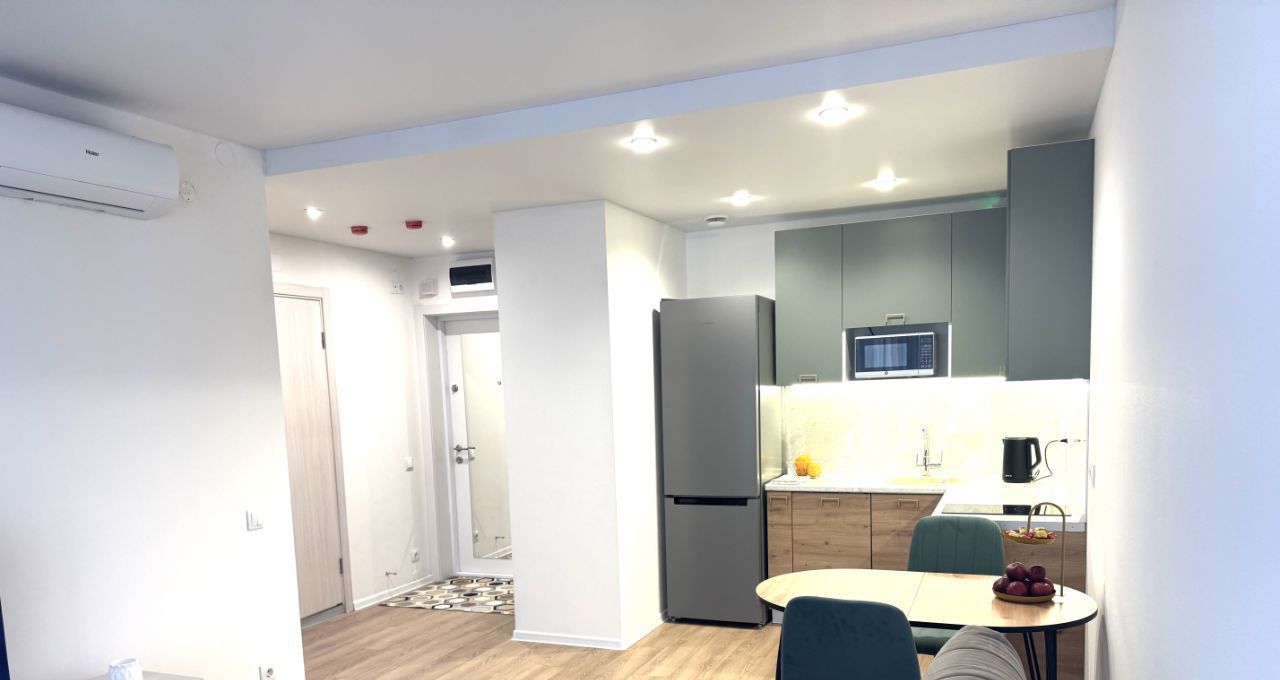Квартира после дизайнерского ремонта, идеально чистая, никто не жил. Планировка Евро-2 — отдельная спальня с большой кроватью (160200) и шкафом, просторная кухня (18 м²) с встроенной техникой: индукционная плита, духовой шкаф, посудомойка, холодильник, микроволновка и проточный фильтр питьевой воды. В гостиной — раскладной диван 200160, телевизор Smart TV и кондиционер.