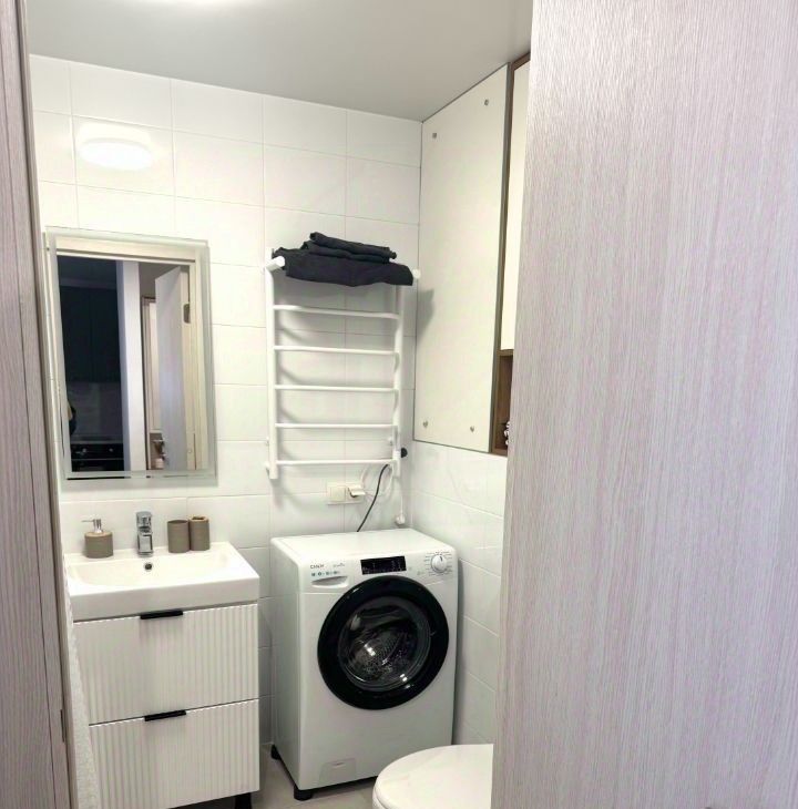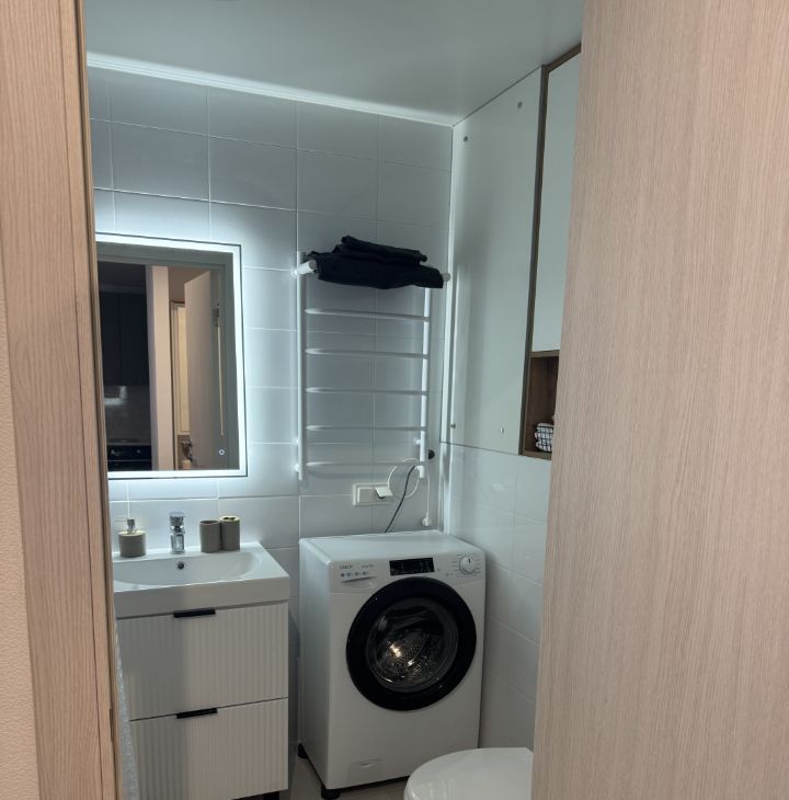Санузел совмещённый, оборудован стиральной машиной, зеркалом с подсветкой и удобной мебелью.