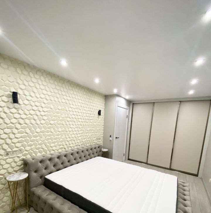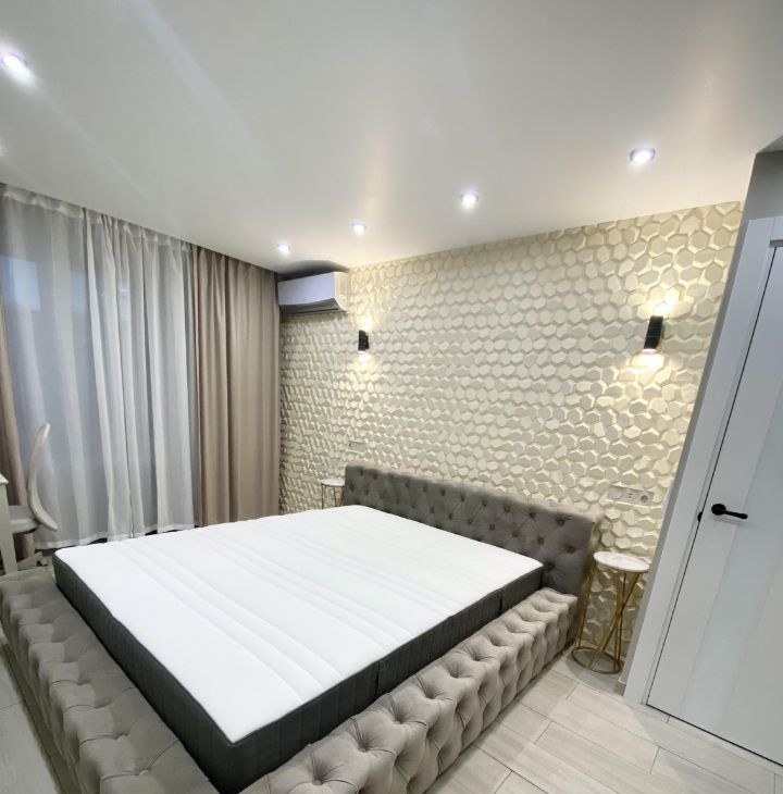 В спальне кровать двуспальная с подъемным механизмом, прикроватные столики, шкаф-купе большой, компьютерный стол, офисный стул.