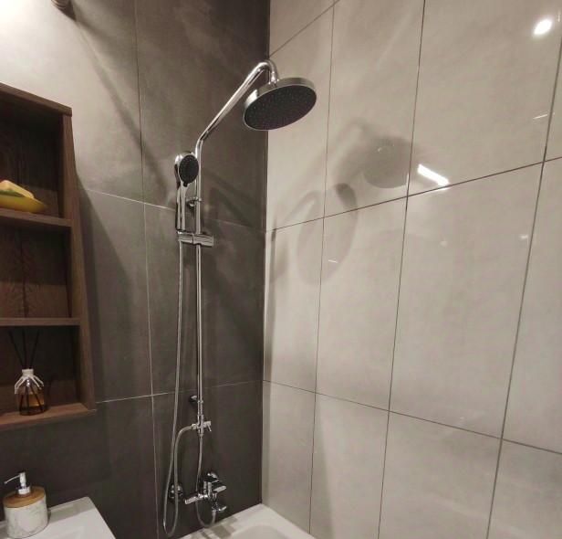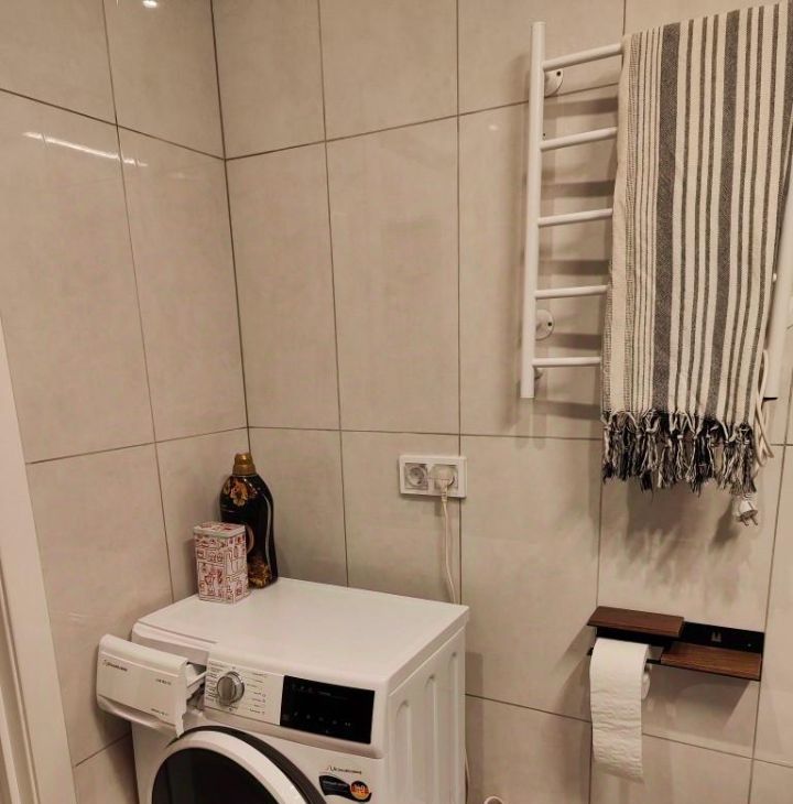 Ванная комната всё эргономично и удобно. Квартира новая, не сдавалась. Все соседи сделали ремонты и в доме поддерживается тишина и порядок. На входе бдительный консьерж. Лифты -их 4, работают исправно, ожидать не приходится.