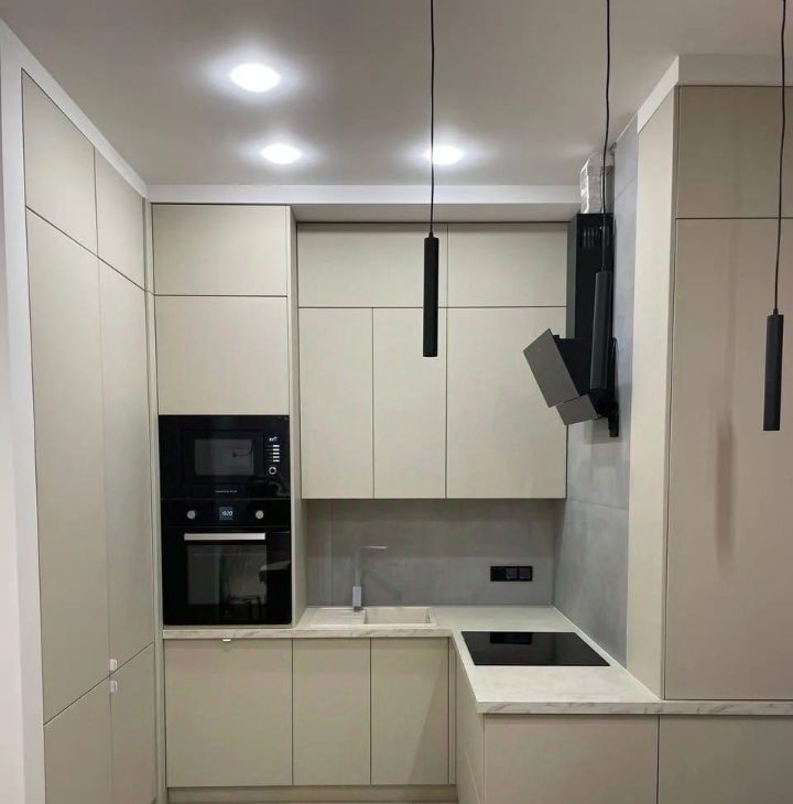 -просторная гостиная с кухней и обеденной зоной ( современная , статусная, встроенная кухня , шикарная мягкая мебель , огромный телевизор с диагональю 85 см)