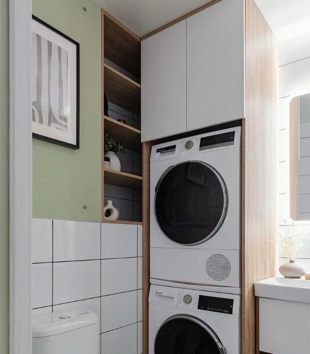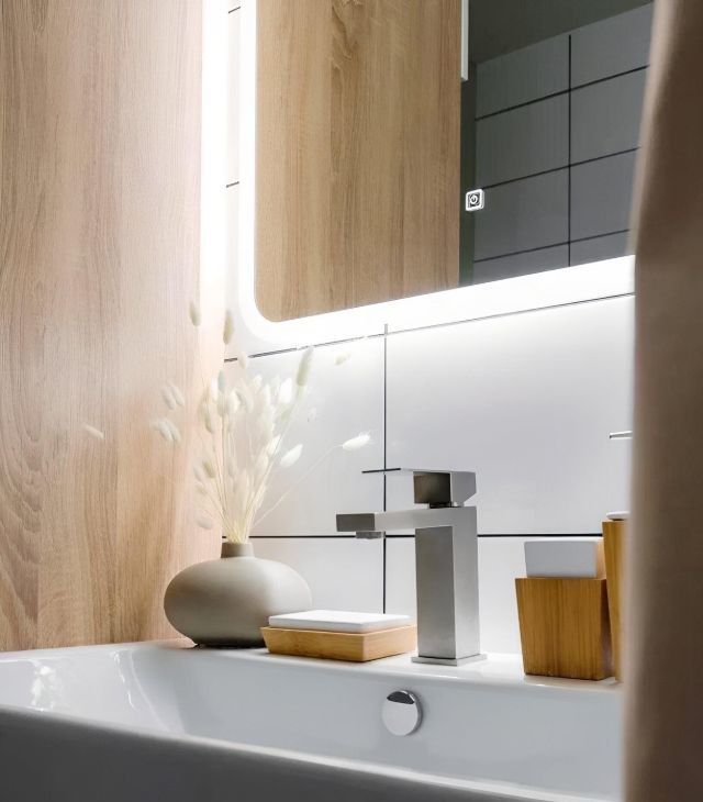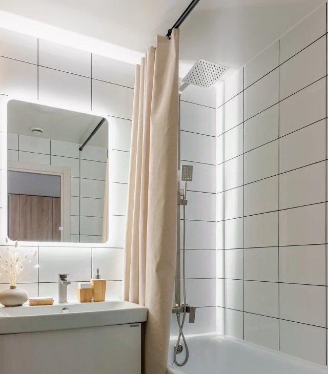 В ванной комнате много места для хранения - встроенный шкаф для бытовой химии и ниша с открывающимся экраном под ванной.