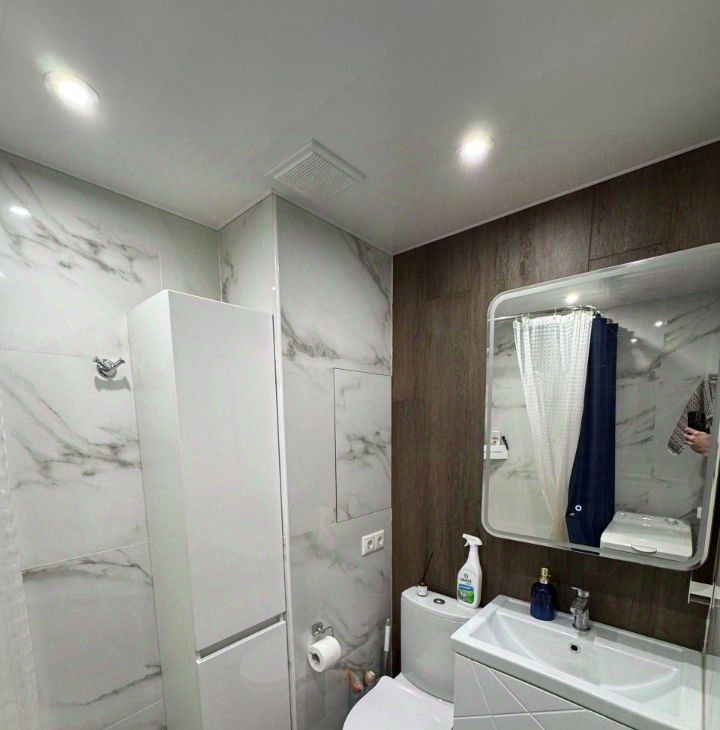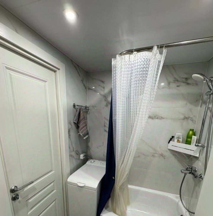 в ванной комнате (совмещенный санузел) поменяны все коммуникации. на стенах и полу керамогранит. стиральная машина с верхней загрузкой.