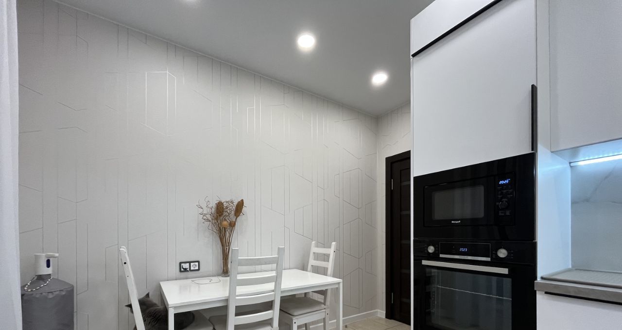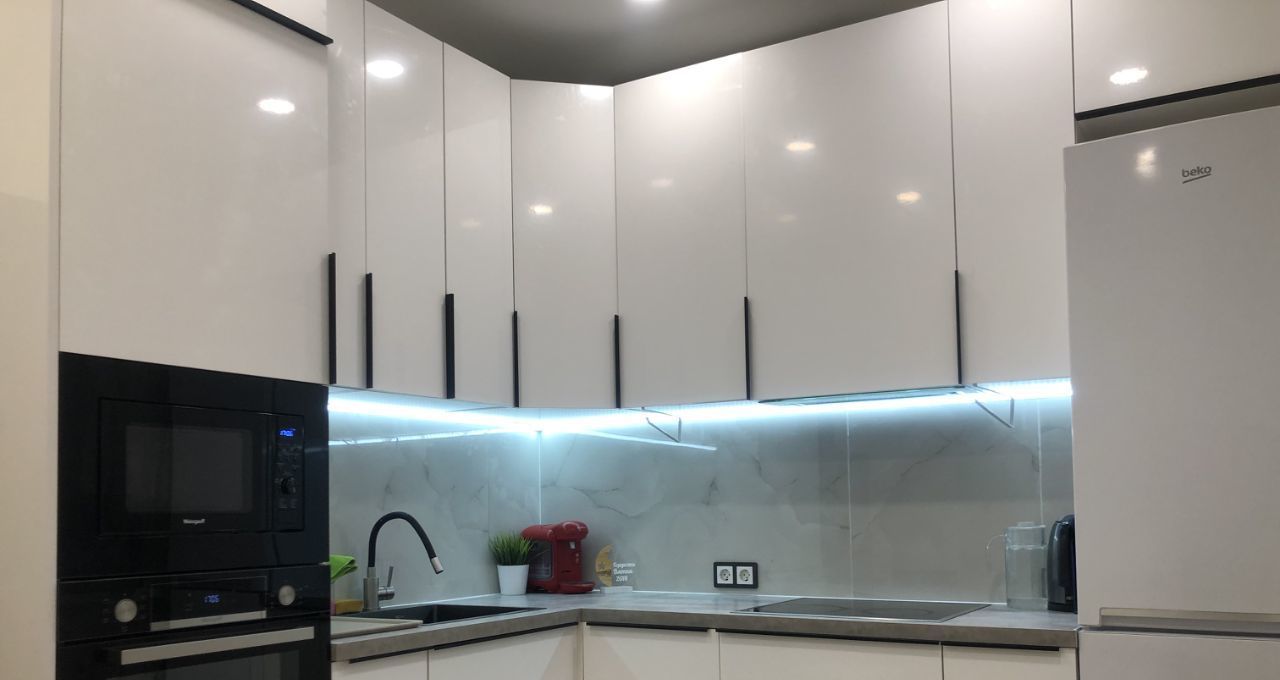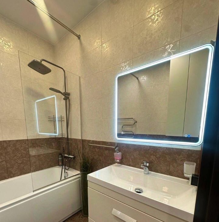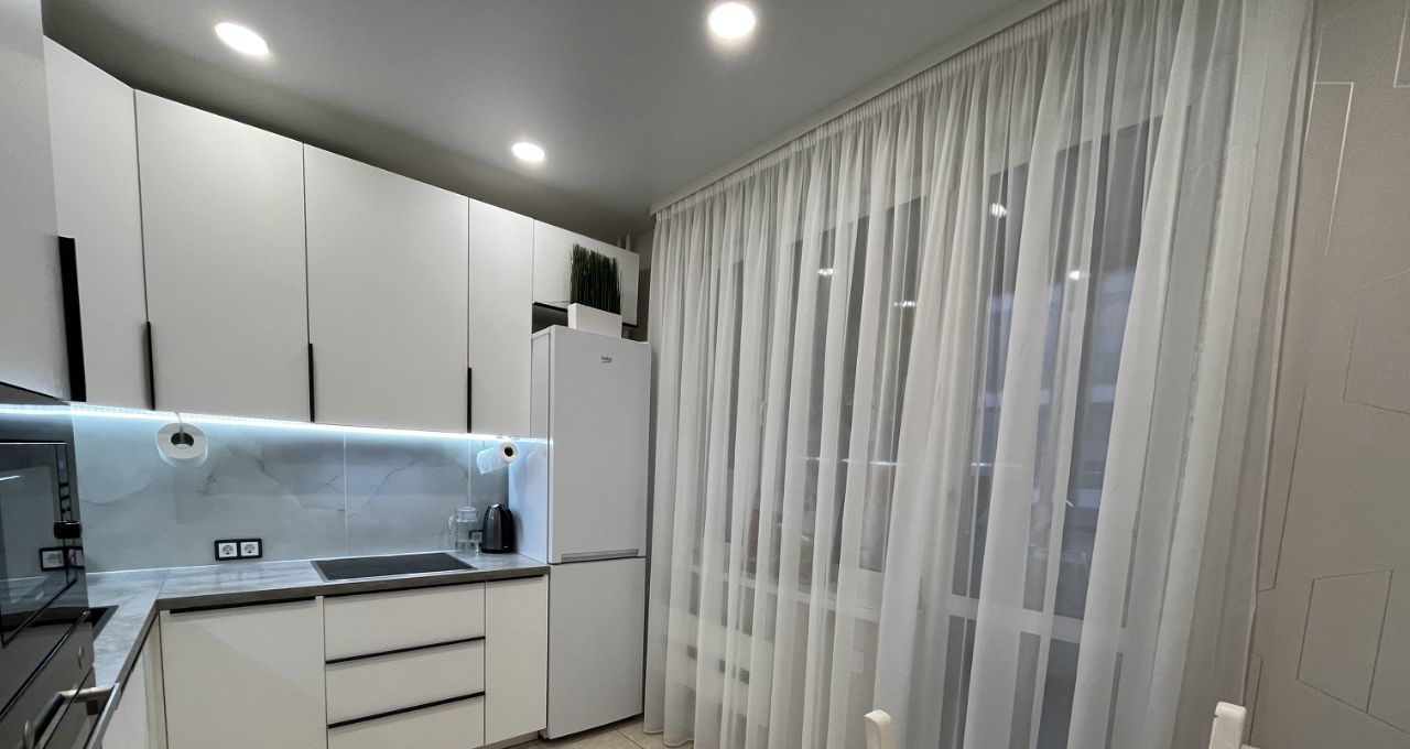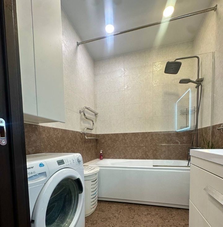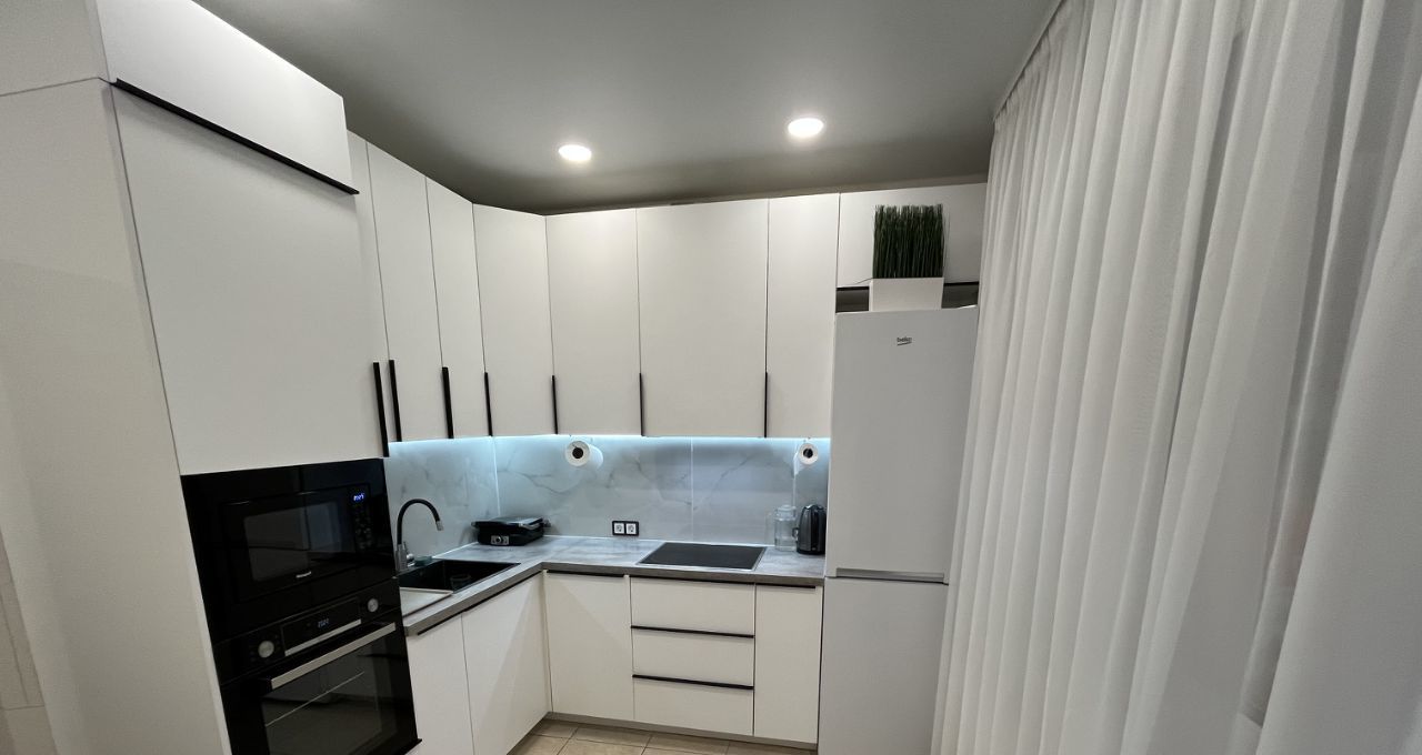 В обеих комнатах встроенные шкафы-купе, на кухне - кухонная мебель с подсветкой рабочей зоны, стеклокерамическая варочная панель, вытяжка, 2 камерный холодильник высотой 2,1м, посудомоечная машина Indesit, микроволновая печь, кофе-машина. В ванной акриловая ванна 1,7м, стиральная машина.