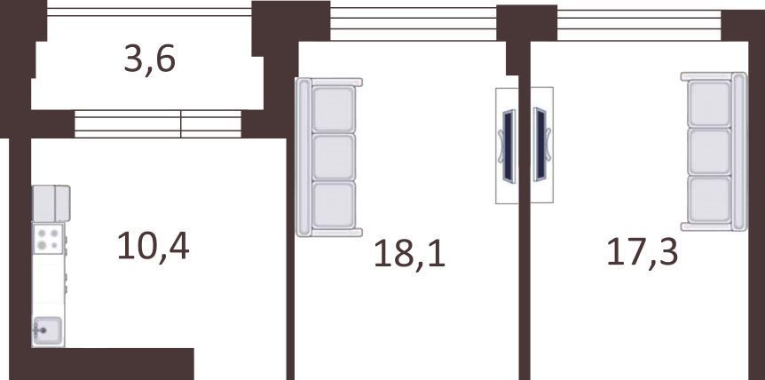Общая площадь 66,8 кв.м. (включая лоджию): в том числе две комнаты 18,1кв.м. и 17,3кв.м., кухня 10,4 кв.м., застекленная лоджия 3,6 кв.м.