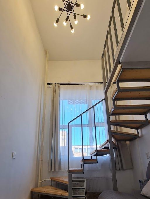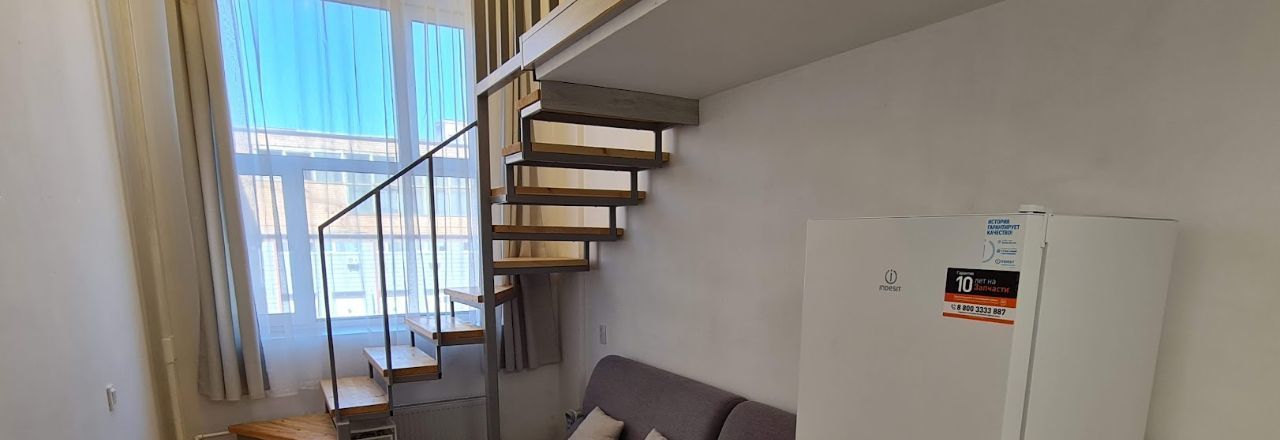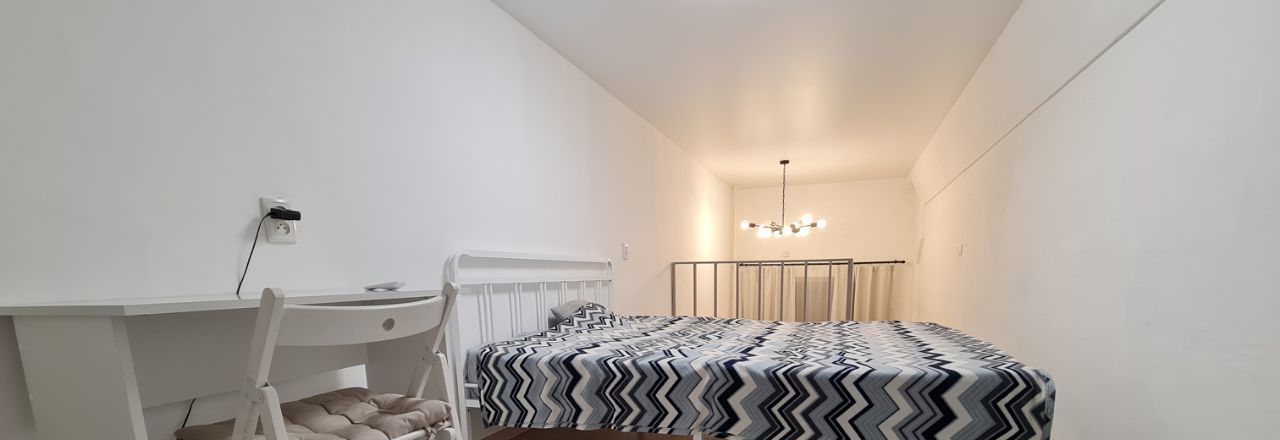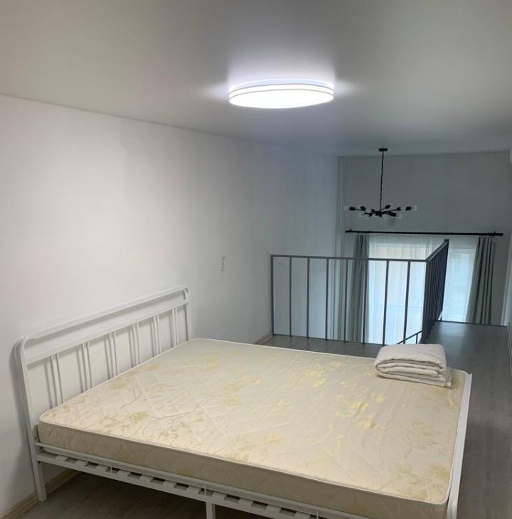 Второй уровень - шкаф, двуспальная кровать. Уникальная возможность жить в необычной квартире!