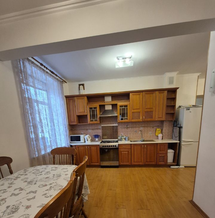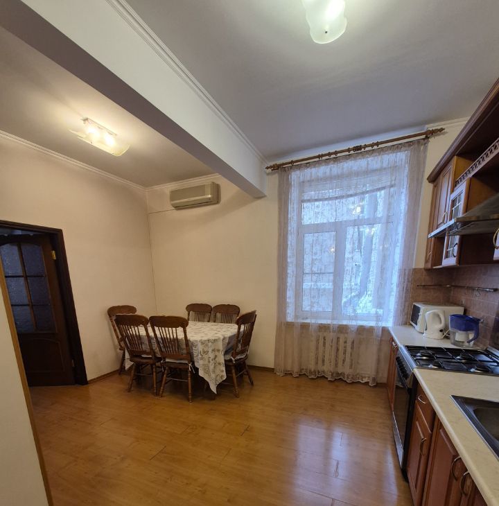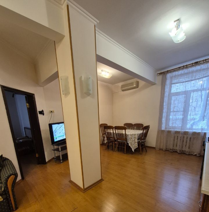 Сдается двухкомнатная квартира в кирпичном доме 1957 года постройки. Квартира теплая, светлая с высокими потоками и большими окнами, из двух комнат окна выходят на улицу, из гостиной во двор. Площадь комнат 17,1 кв м и 13,4 кв м, большая кухня-гостиная 19,9 кв м, квартира укомплектована современной мебелью, есть холодильник, стиральная и посудомоечная машины, два кондиционера, телевизор, СВЧ. Большой совмещенный санузел отделан плиткой, установлена ванна. В квартире созданы все условия для комфортного проживания. Спокойные, приличные соседи, есть консьерж. Сдается квартира на длительный срок, арендатор платит по счетчикам, проживать можно с кошечкой.