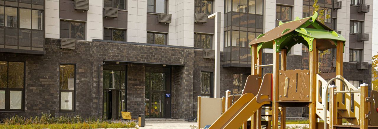 Территория дома организована как закрытое от транспорта пространство с продуманным озеленением и маршрутами для прогулок. Во дворе размещены детские и спортивные площадки, зоны отдыха и элементы ландшафтного благоустройства.