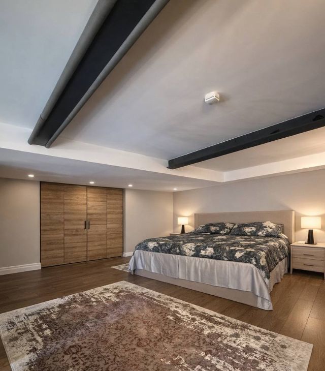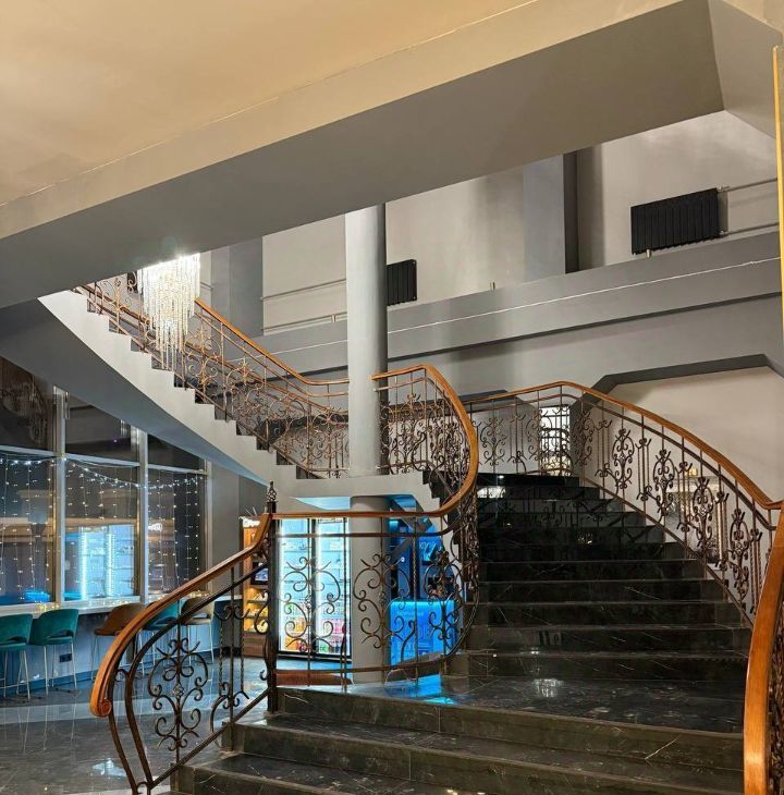 На второй этаж ведет лестница из дерева с безопасными ограждениями