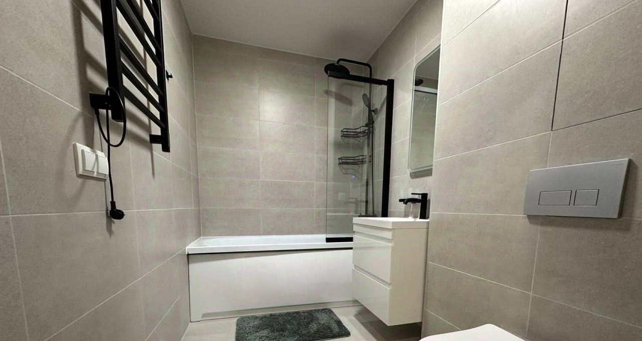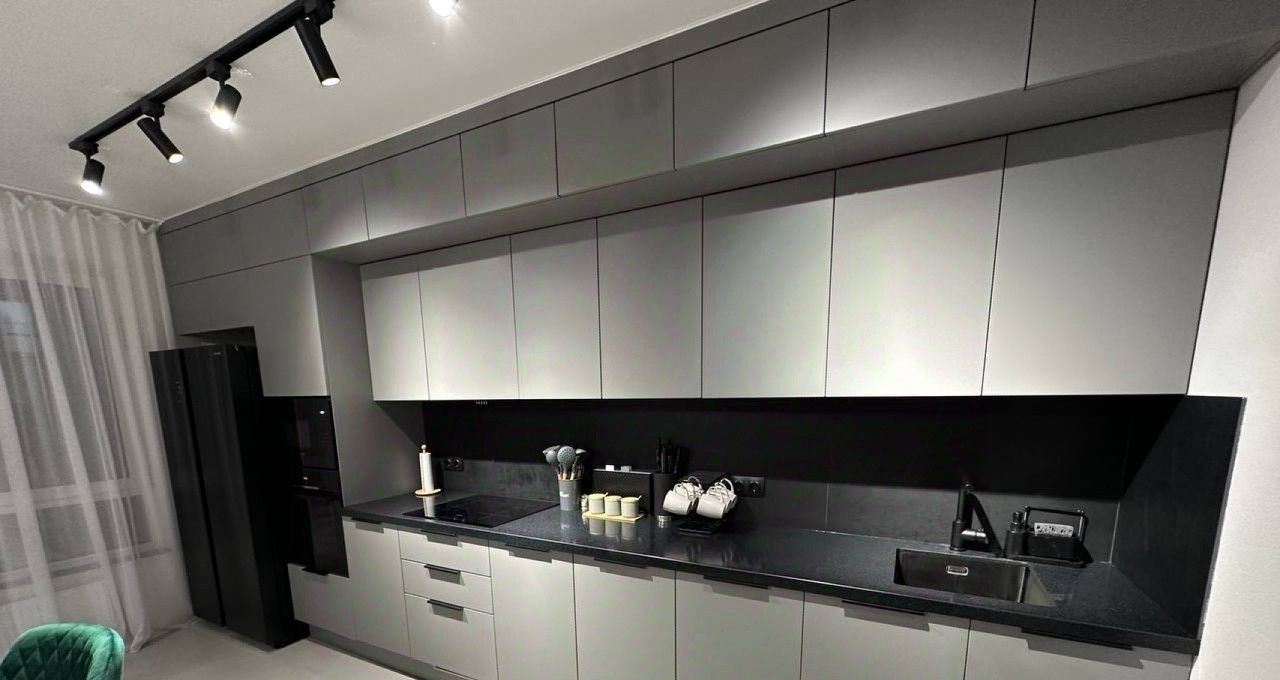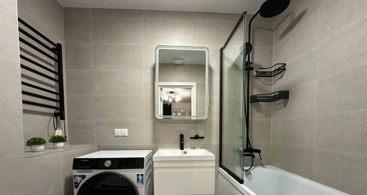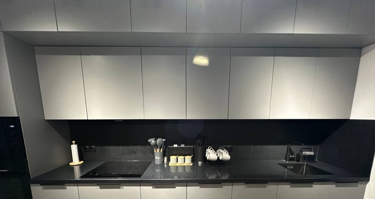 Кухня полностью оборудована: индукционная варочная панель, встроенный духовой шкаф, микроволновка, холодильник, посудомоечная машина, фильтр для воды, посуда — можно заезжать и жить без дополнительных покупок.