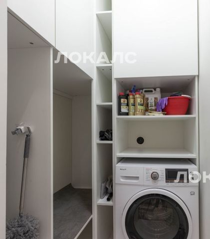 Постирочная комната (вход из прихожей) со стирально-сушильной машиной и полками для хранения хозяйственных нужд и объемных предметов.