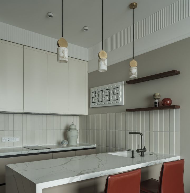 Ремонт выполнен в азиатском (джапанди) стиле, в отделке использованы качественные материалы - керамогранит, дуб, орех, кварц, мрамор, натуральный камень, элементы мозаики, живопись.